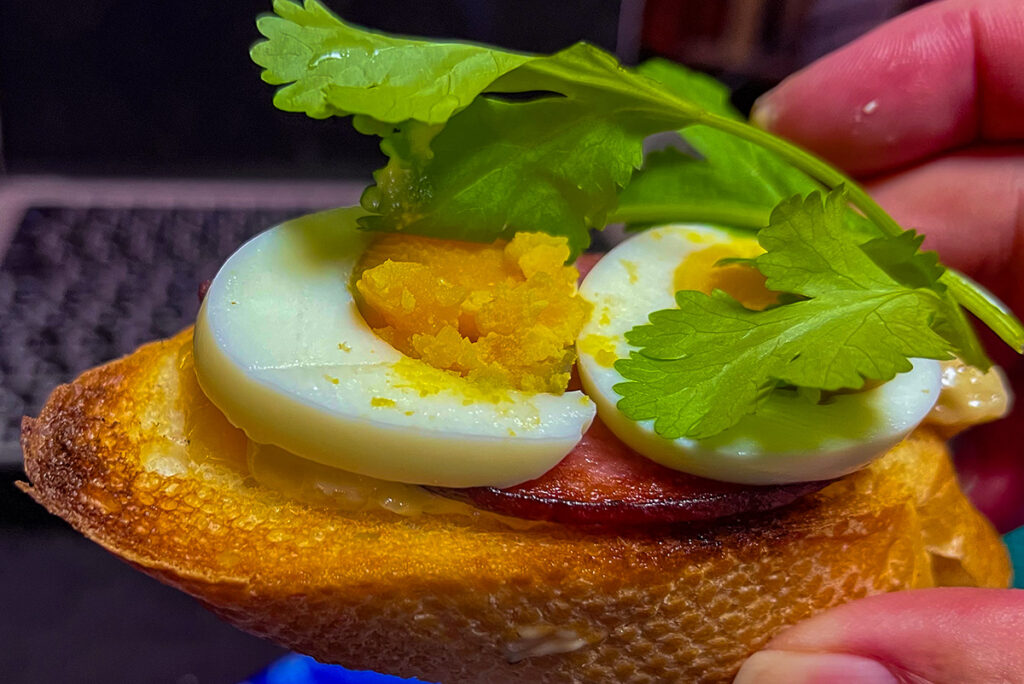 サクサクしたバゲットにソーセージとタマゴとパクチーの組み合わせがいい。