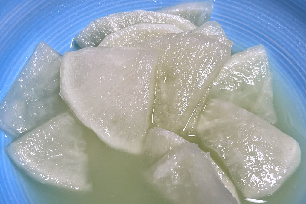 つけあわせに大根のわさび漬け。シャキシャキっとした食感で控えめな山葵風味。