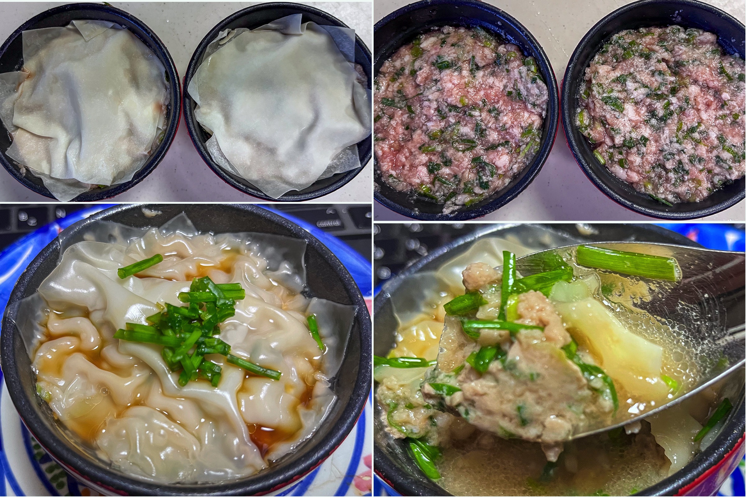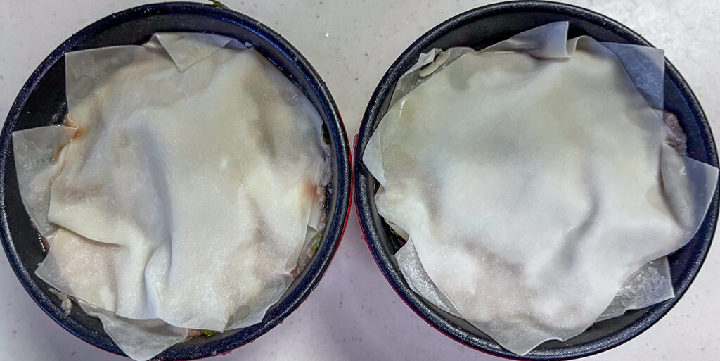ごま油を薄く塗ったココット皿に絞り出したら上から餃子の皮を被せる。