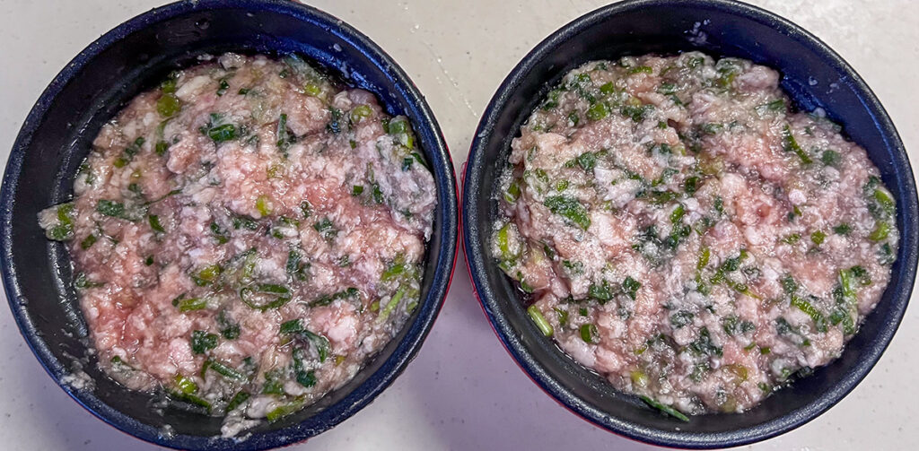 ビニール袋にひき肉200グラムと刻んだネギを入れ、水100cc、鶏がらスープの顆粒、砂糖、酒、醤油にオイスターソースとごま油を各小さじ1にしょうがチューブを3センチ位入れてよく揉みこむ。