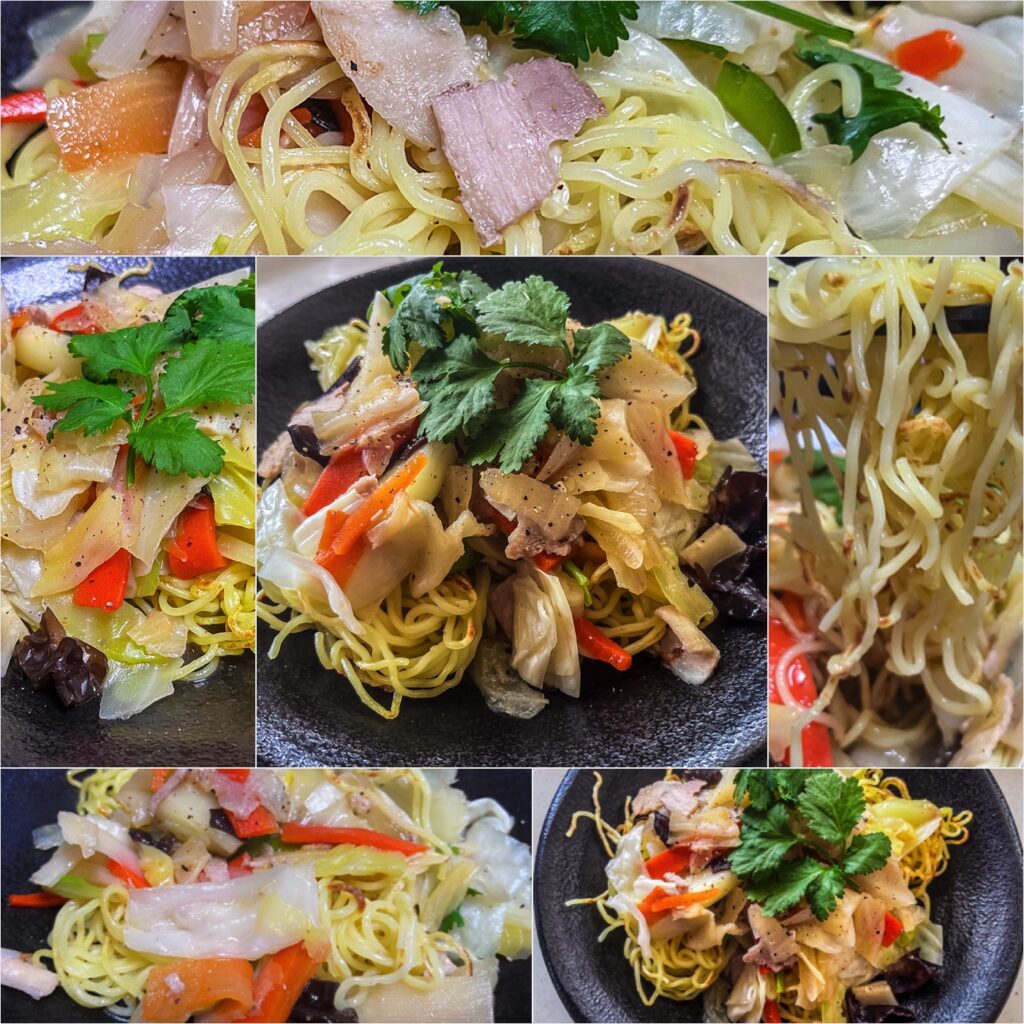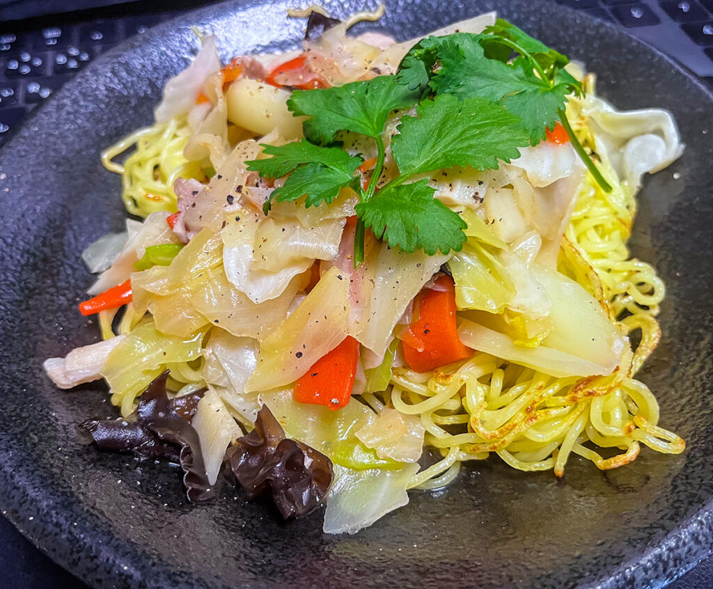 フライパンでそのまま炒めてから水と顆粒チキンにとろみちゃんをいれ、醤油と胡椒で味を調整したら、両面を4分づつ焼いた麺にトッピング。