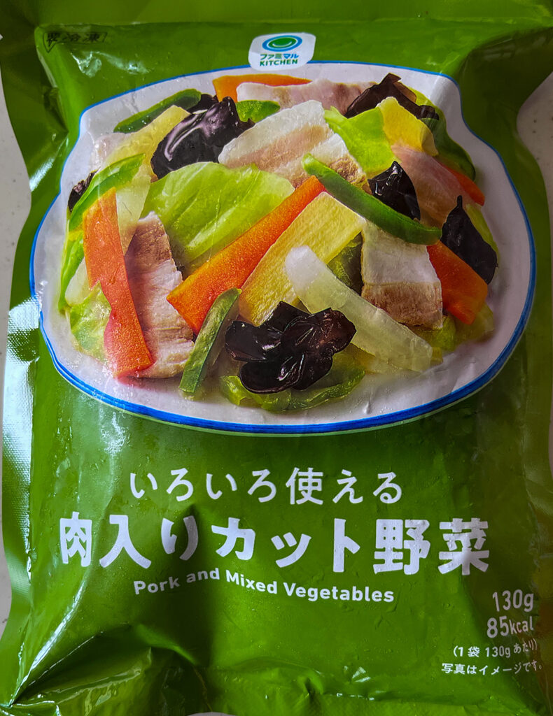 ふぁみまるの肉入りカット野菜を一袋使ってみたけど、これ便利だ。150円とお手軽値段。