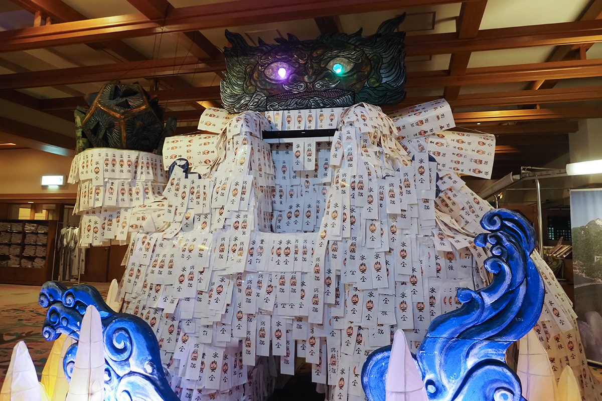 大町市のむかし話『泉小太郎』に登場する犀龍(さいりゅう)様をイメージしたもので、大きさ3.5m迫力。私たちも願いを書いて犀龍様に貼らせてもらった。