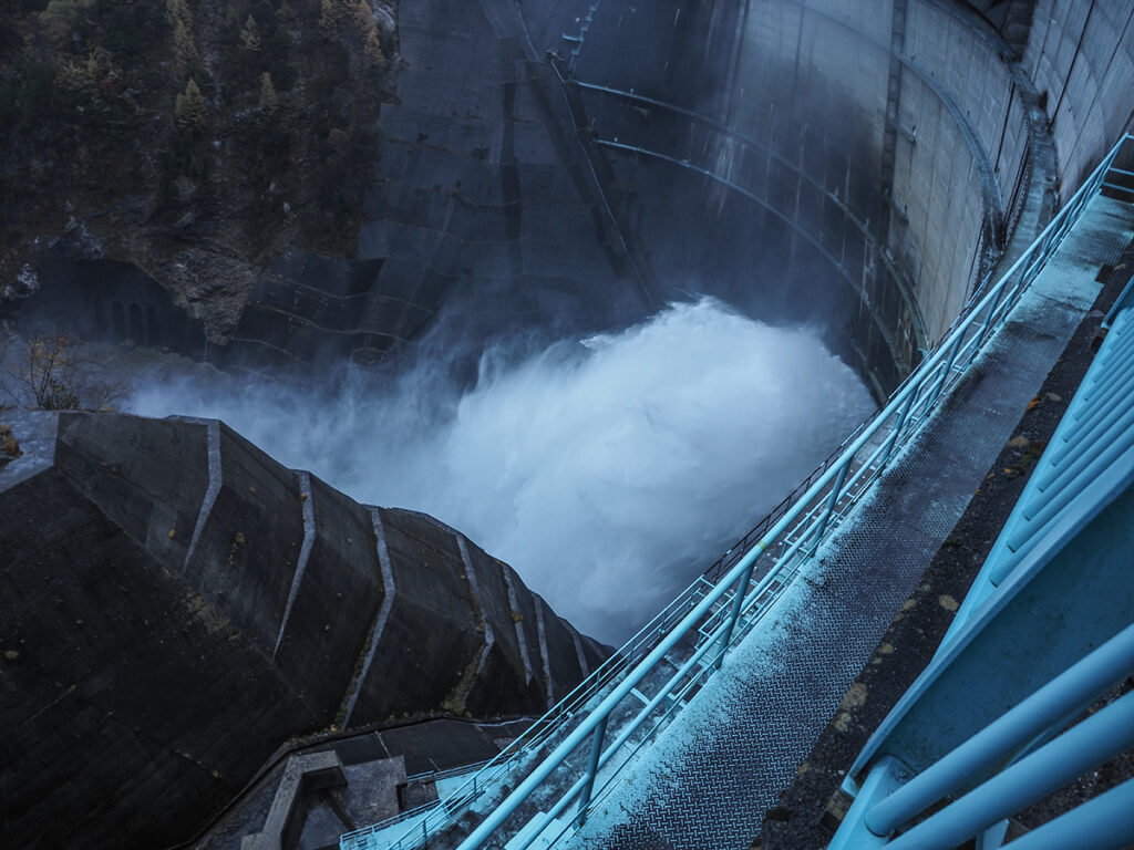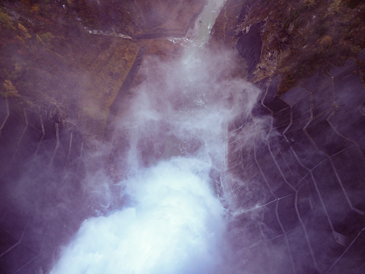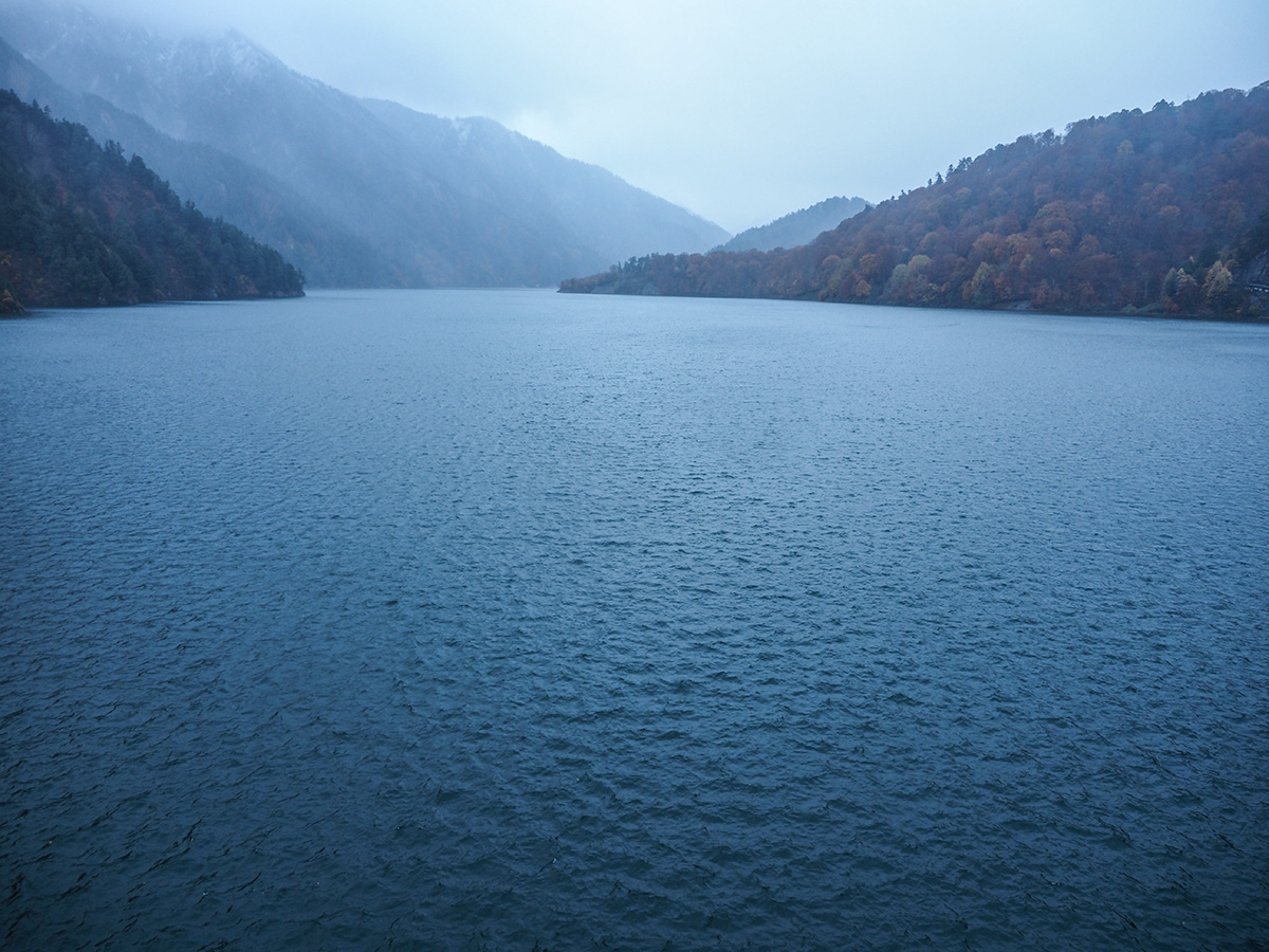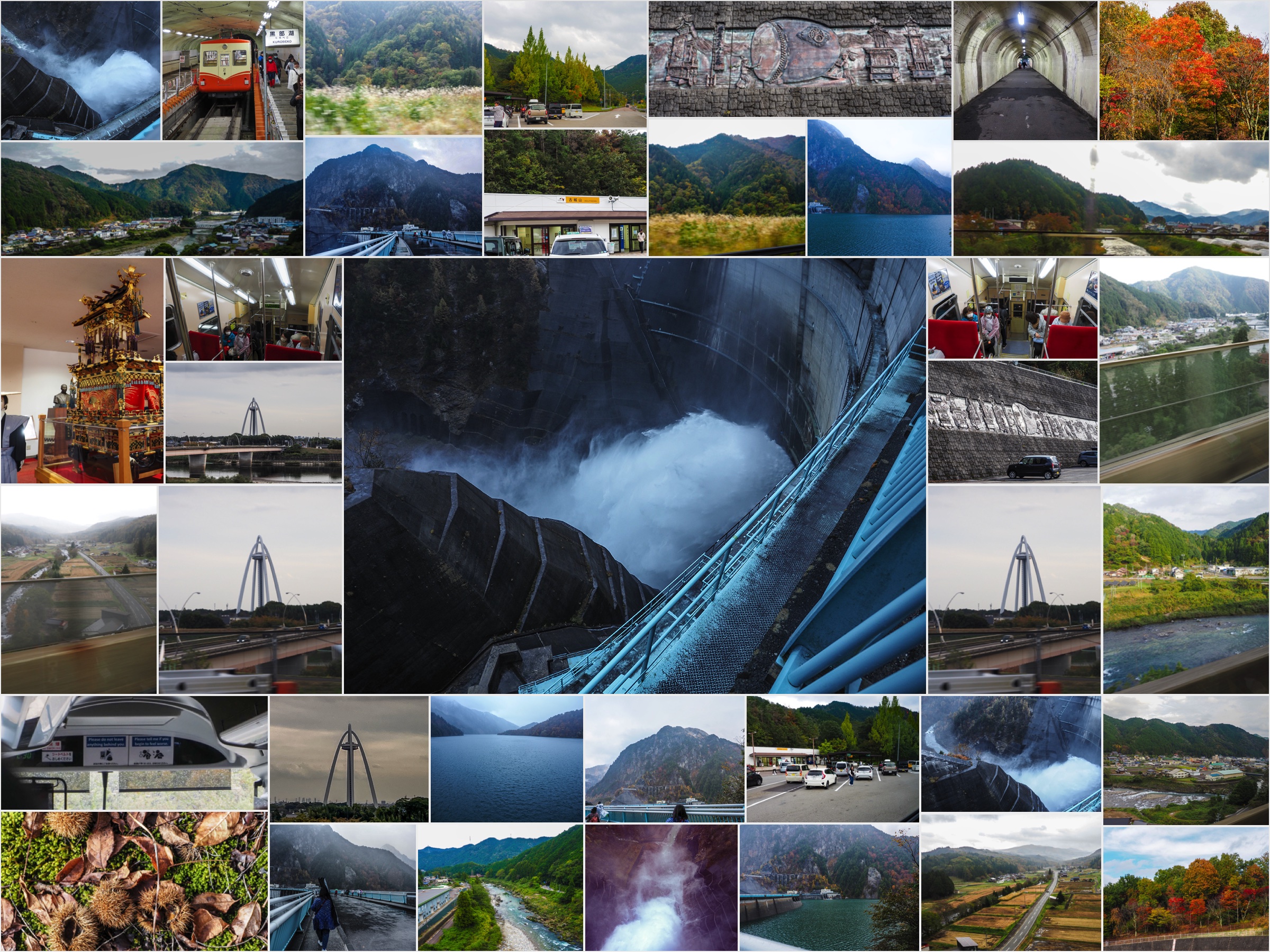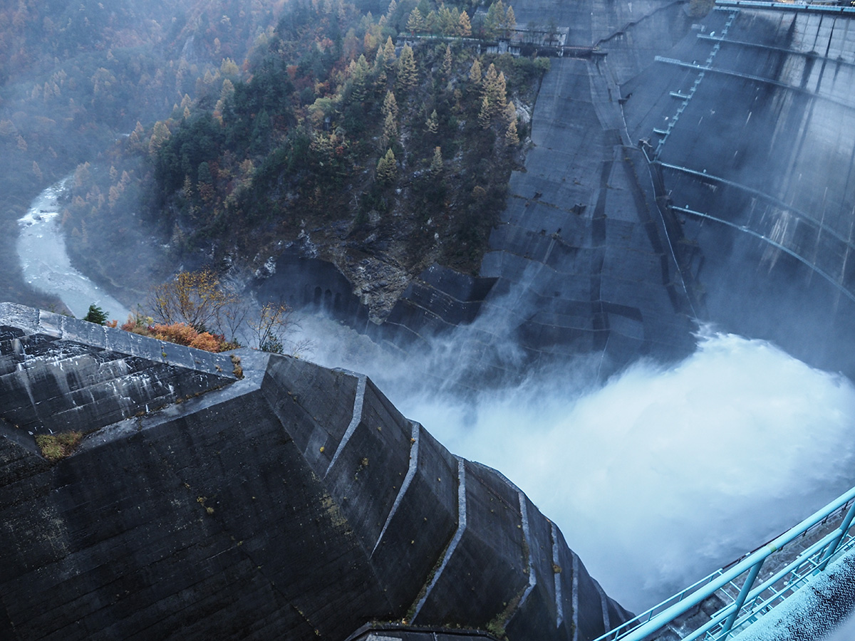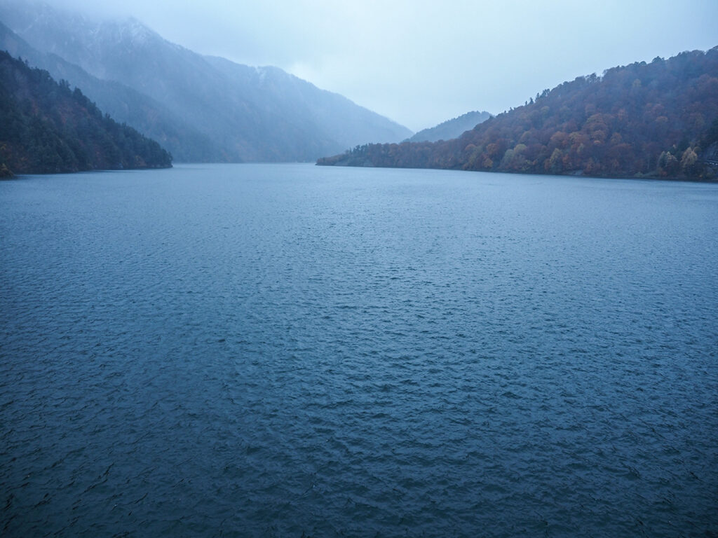 あいにくの天気だったけど、ダムの上の道のえん堤を500mほど、傘を差しながら歩いた。えん堤の高さは日本一の186m。もらった資料だと観光放水期間は10/15までだけど、この日11/1も大音響で放水しているのが見られてよかった。