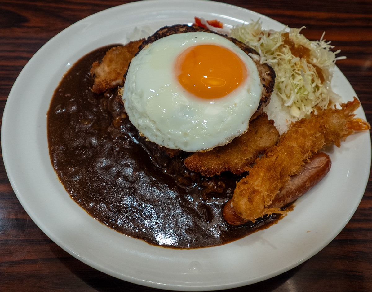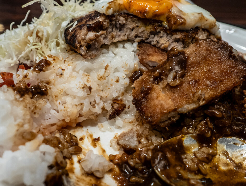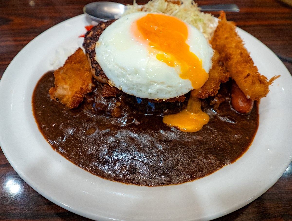他にソーセージ、カツ1、ハンバーグ、目玉焼きが積み重なっている。