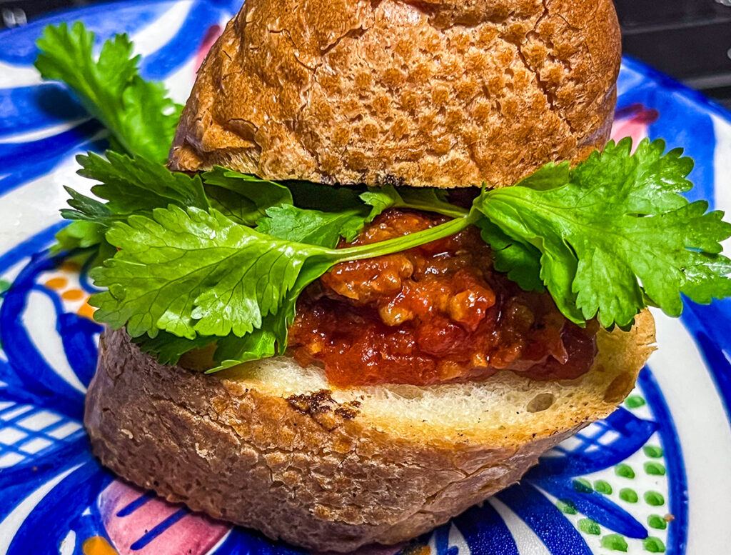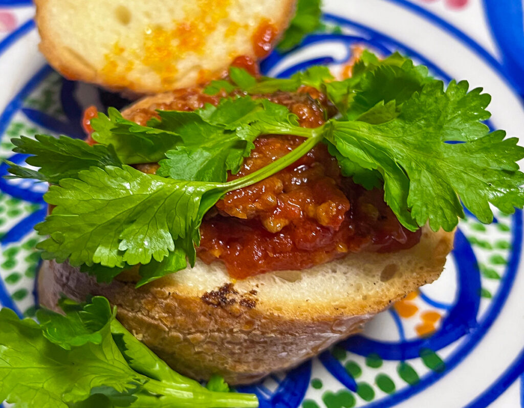 昨夜のトマトソースでパクチーとともにバゲット。