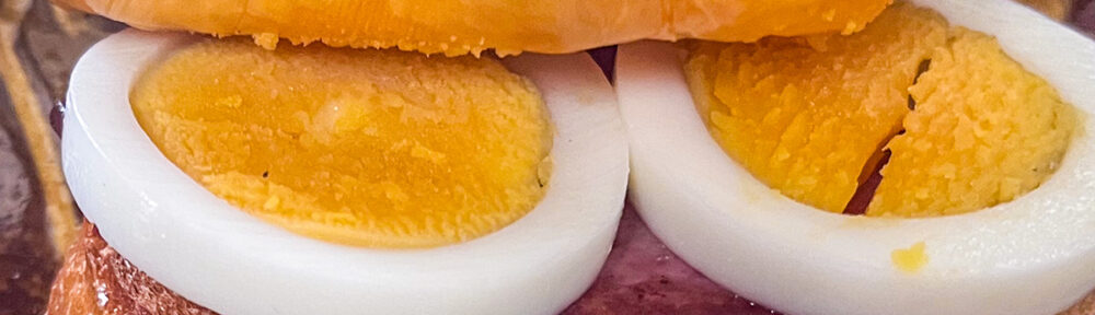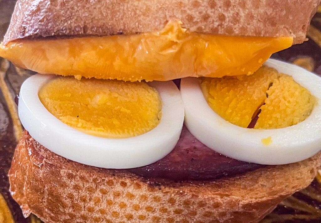 バゲットの片面に焼き目をつけたら、ひっくり返してメルティングチーズをのせて、しばらく焼いてから別に焼いたソーセージとスライスしたゆで卵をトッピング。