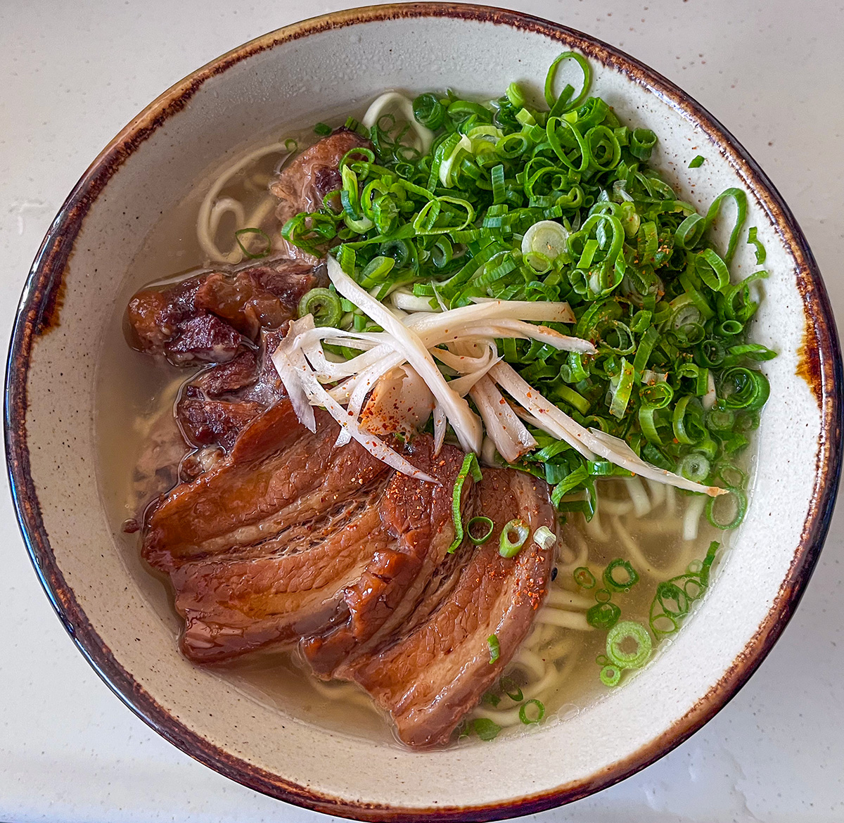 生姜の酢漬けの細切りとネギたっぷりな三枚肉軟骨ソーキそば。