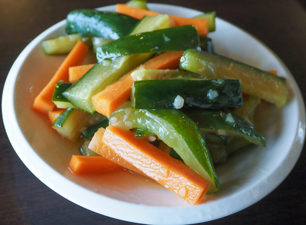 叩ききゅうりと黒烏龍茶。キュウリもニンジンも味も歯ごたえもとてもいい。