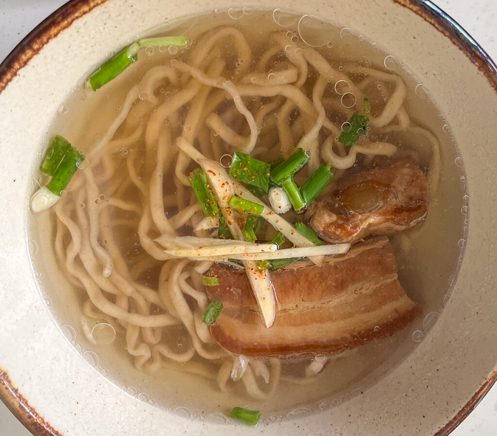 残りの麺で汁そばにしてみた。軟骨ソーキ、三枚肉に生姜とネギをトッピング。