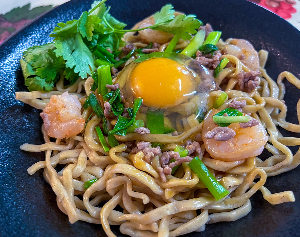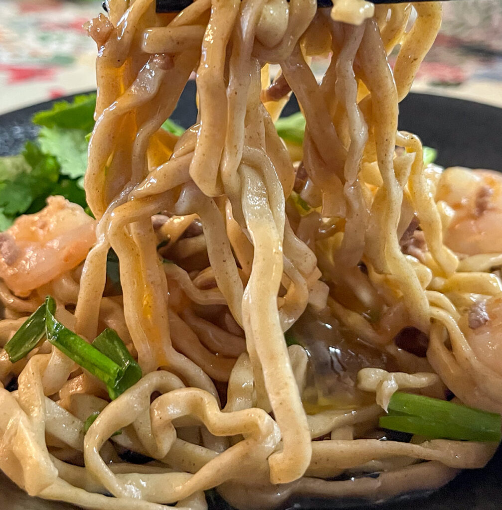 海老とひき肉を炒めてさっと湯通しした麺の周りに沖縄産のパクチーとともにトッピング。