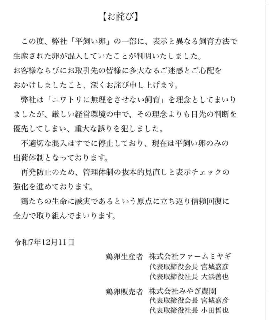 「みやぎ農園」が、「平飼い」ではない卵を「平飼い」と偽って販売していたことを同社は12/11、公式インスタグラムとfacebookと新聞で「お詫び」とする謝罪文を掲載したようだ。