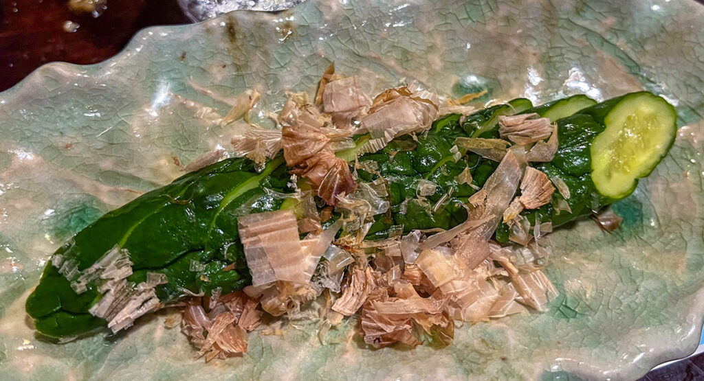 野菜系も食べたいなってことで、キュウリの浅漬けの鰹節まぶしにレタスの和物。