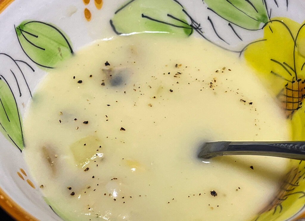 and with delicious soup packed with clams.