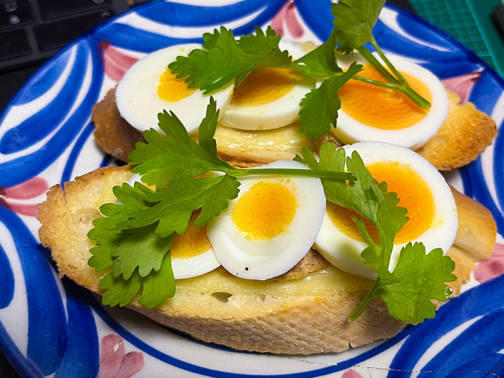 morning baguette with cheese, lever paste, boiled eggs and cilantro.