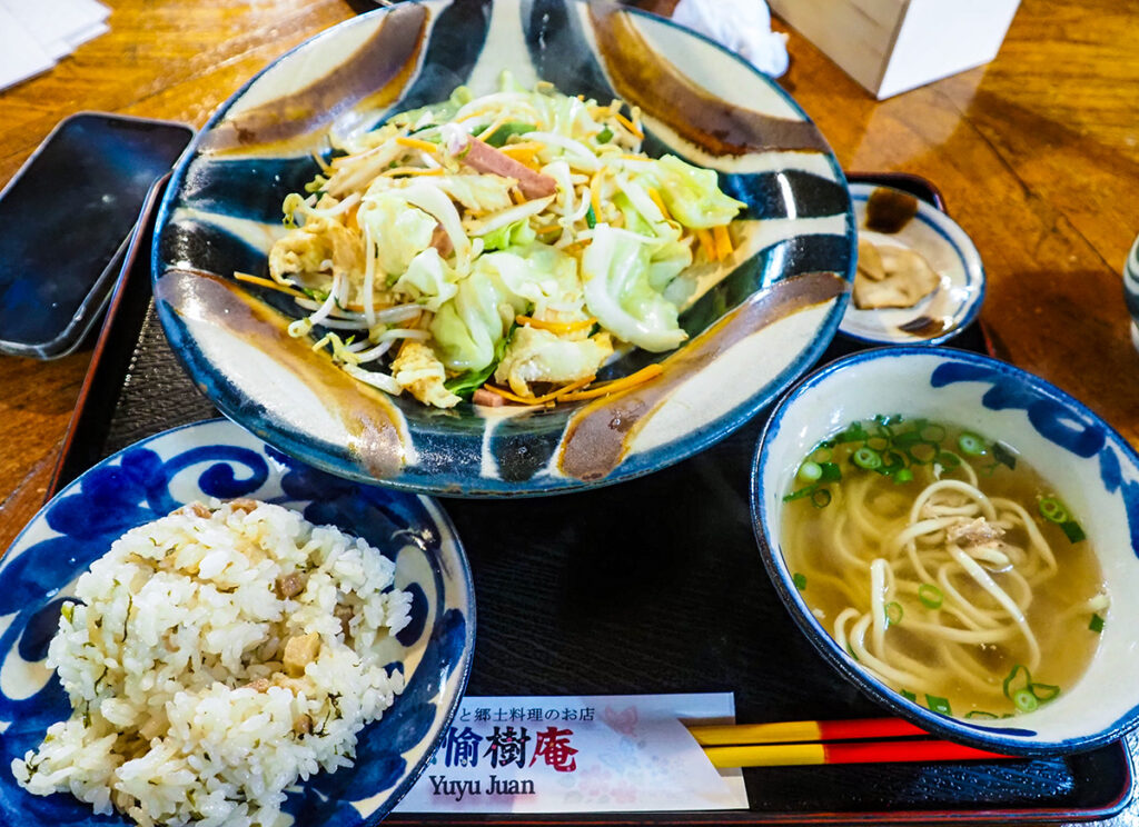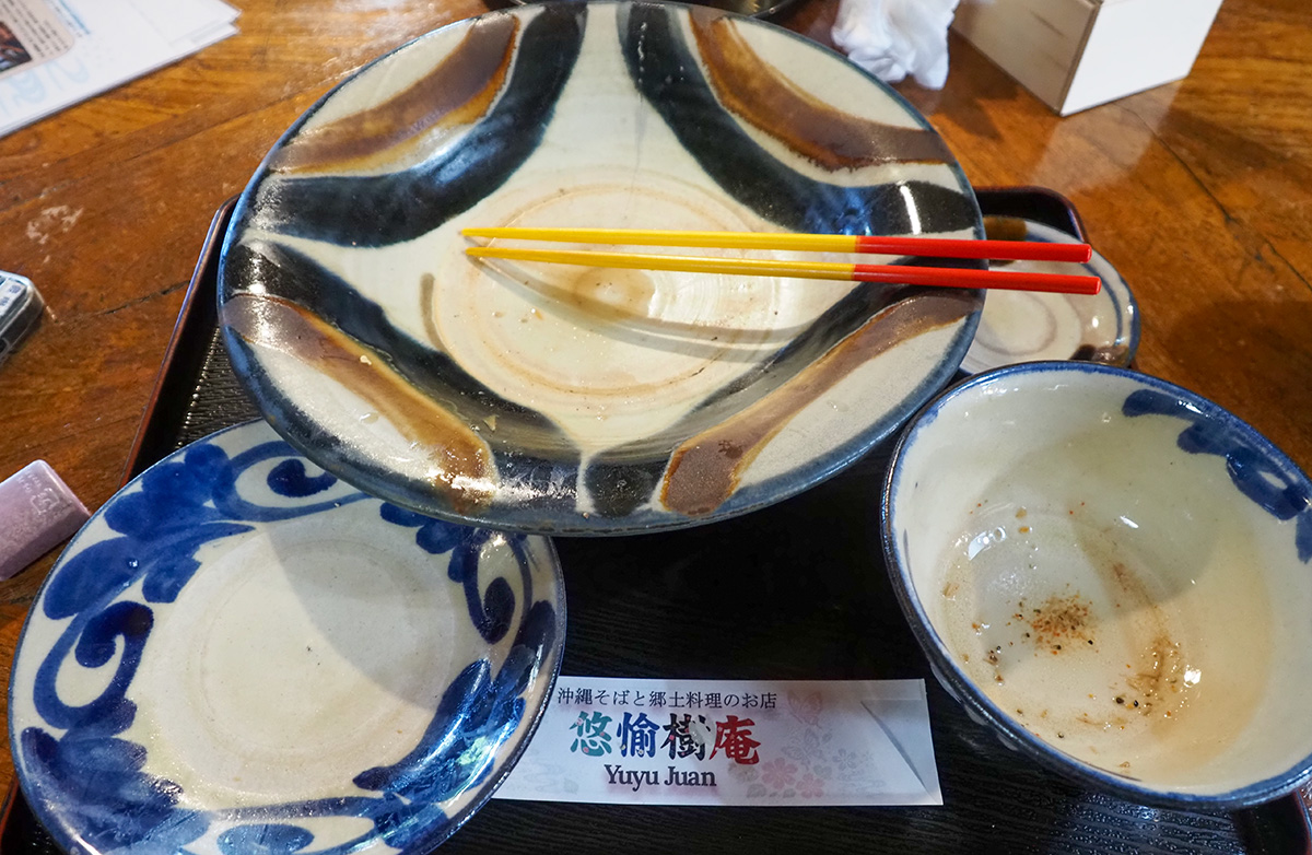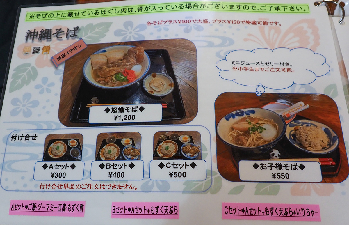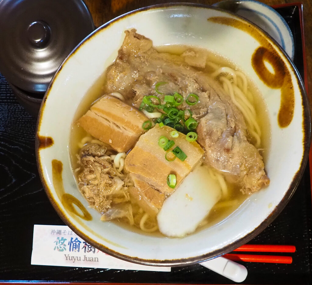 oct.16th thu. 2025 久しぶりに悠愉樹庵(ゆうゆじゅあん)でそばを食べに行ってみた。 < つい最近リニューアルしてオープンと聞いてやってきた。 私には、正しければ前に来てから、10年ぶりだ。 メニューは結構豊富だ。 そば以外にもゆし豆腐やチャンプルー定食やジーマミ豆腐などもあるし、セットなどもある。 でも、やっぱりそば。悠愉そば1200円にしてみよう。 西崎製麺のツルゴワな歯触りのいい麺に甘味のあるすっきりスープ。 よく煮込まれて柔らかな軟骨、本ソーキに三枚肉。 軟骨はトロットロだし、三枚肉も柔らかくさっくりで本ソーキもしっとり柔らかで美味い。…