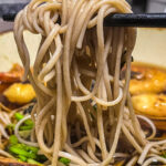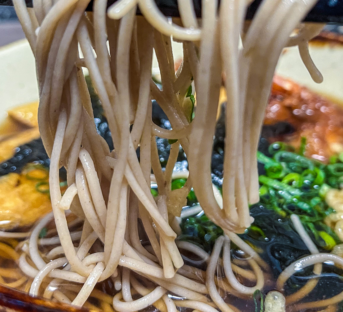 十割蕎麦は茹でた後に冷水で洗いさらに熱湯であっためてから熱々のスープへ投入。