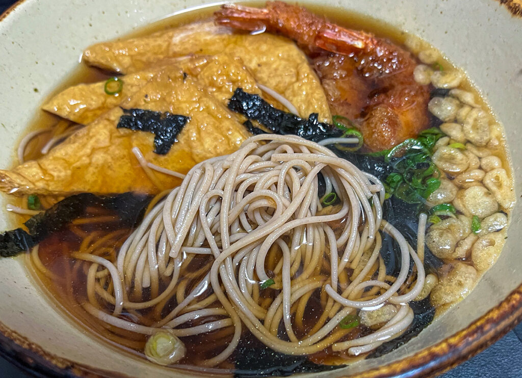 甘いキツネに揚げたての海老天に天かす。ネギと海苔をトッピングして七味をプラス。