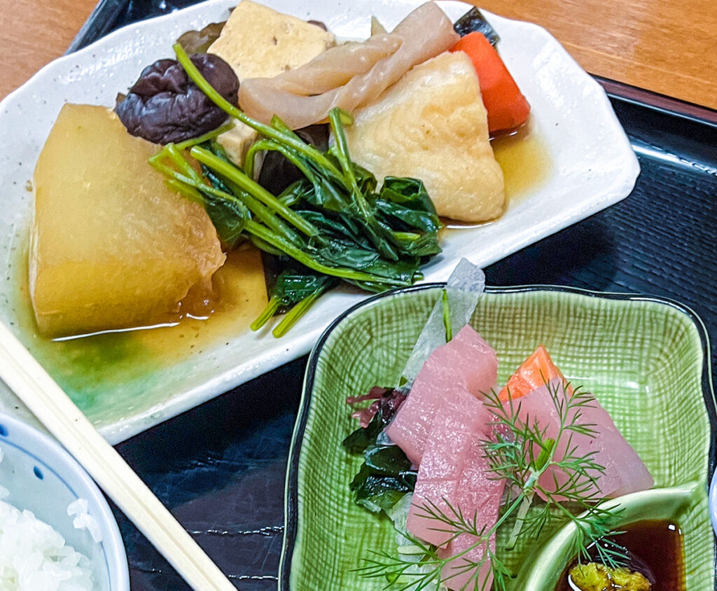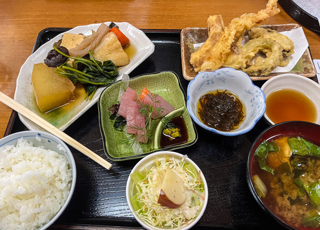天ぷらに煮物と刺身にもずく酢。味噌汁とご飯にプチデザート。
