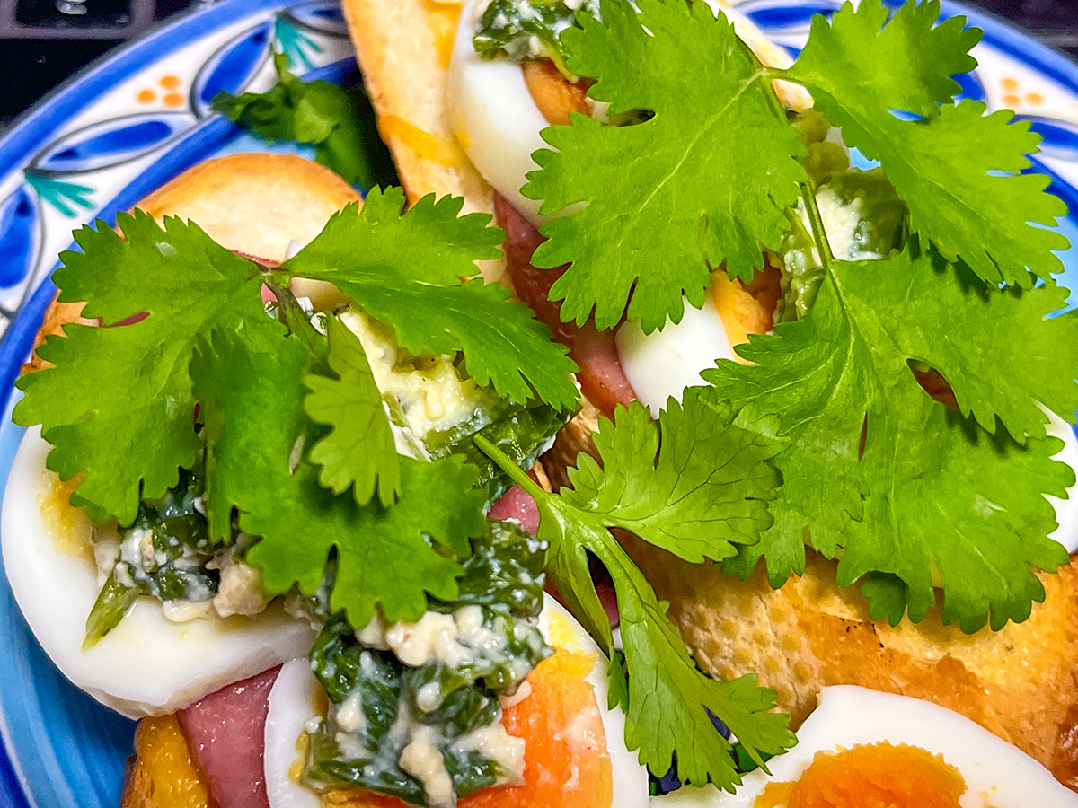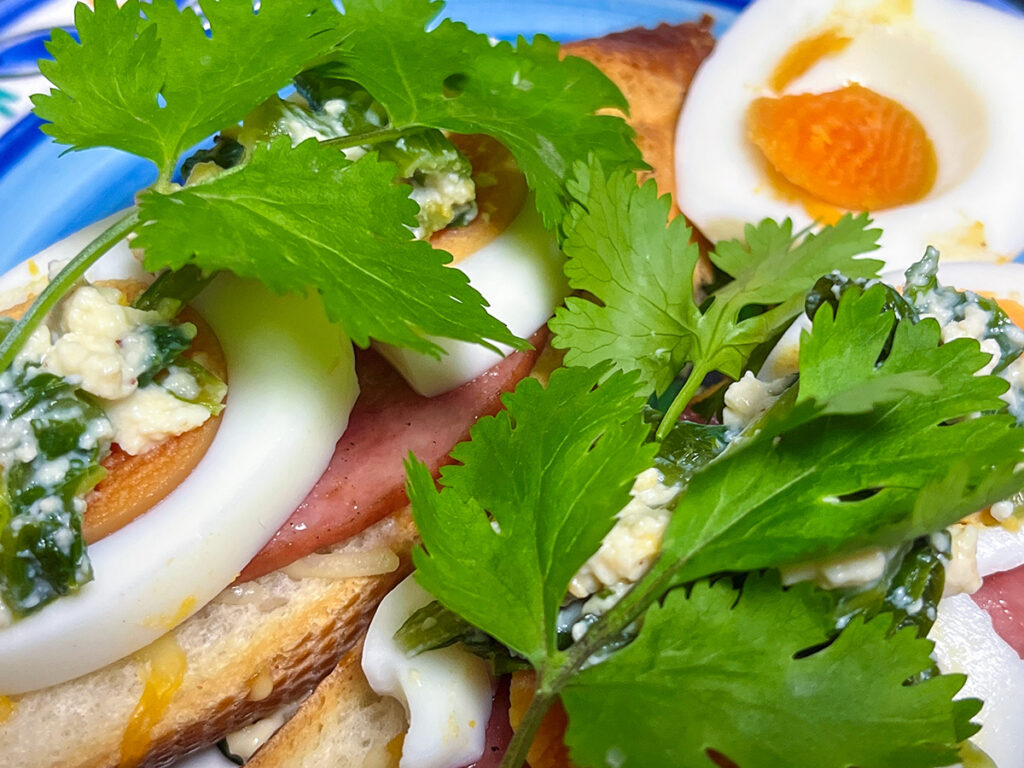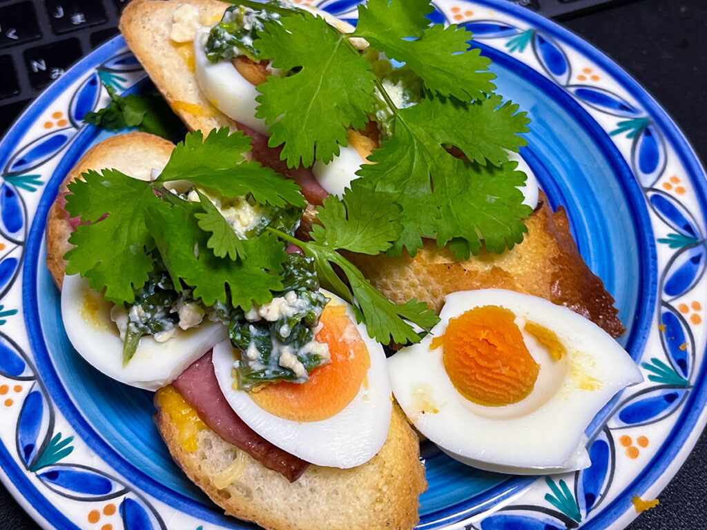 dec.16th tue. 2025 morning baguette with cheese, boiled eggs and cilantro いつもの朝のバゲットは、片面を炙ったバゲットをひっくり返す。 それにとろけるチーズを乗せて、タルタルソースとレベーベーストをトッピング。 チーズが溶けたらスライスしたゆで卵にパクチーをトッピング。 あとはアイスコーヒーとともにモーニング。…