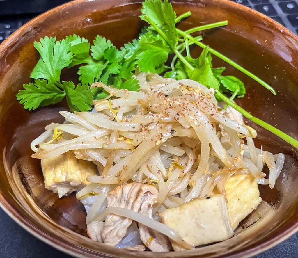 昨夜のもやしたっぷりな豆腐チャンプルーの残りを使って朝の丼飯。