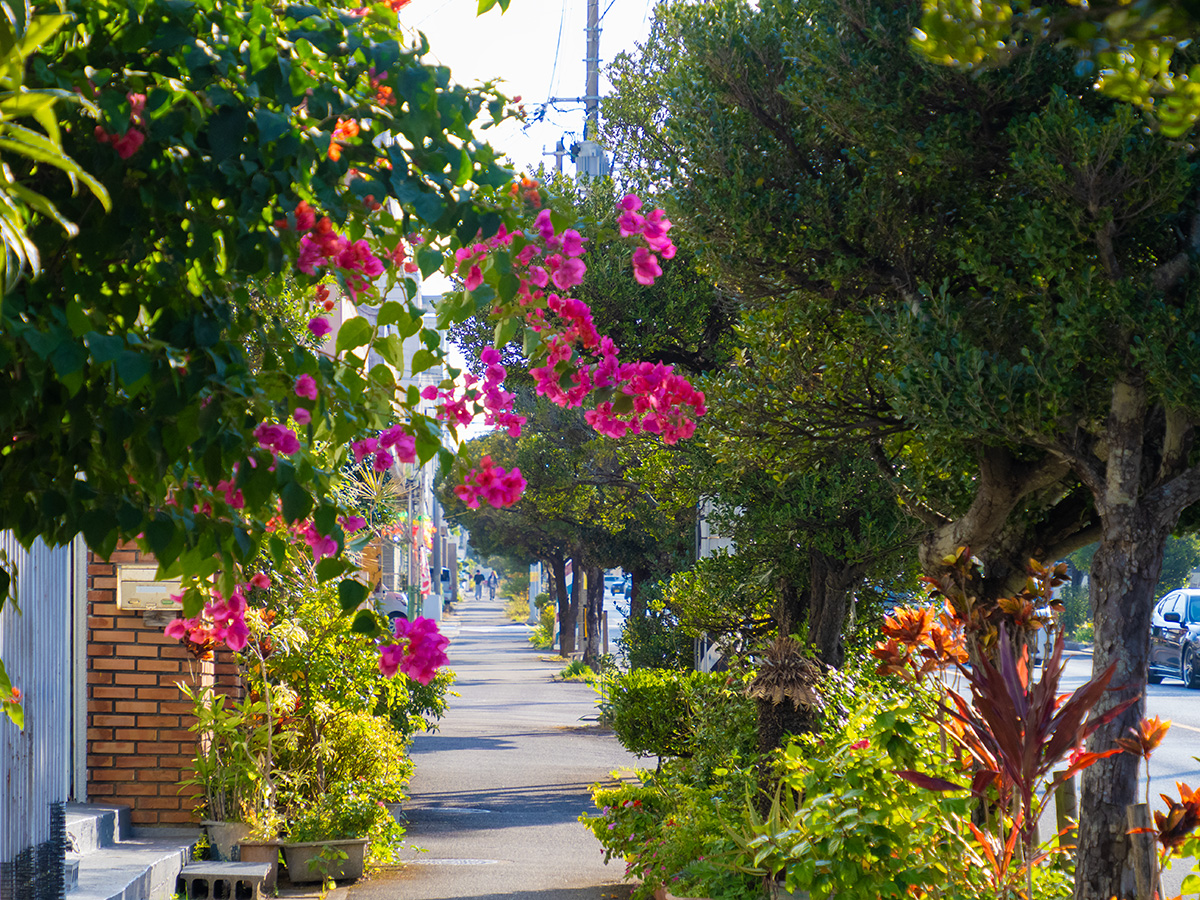 歩道の両側にもブーゲンビレアを始めいろんな花と緑が溢れている。