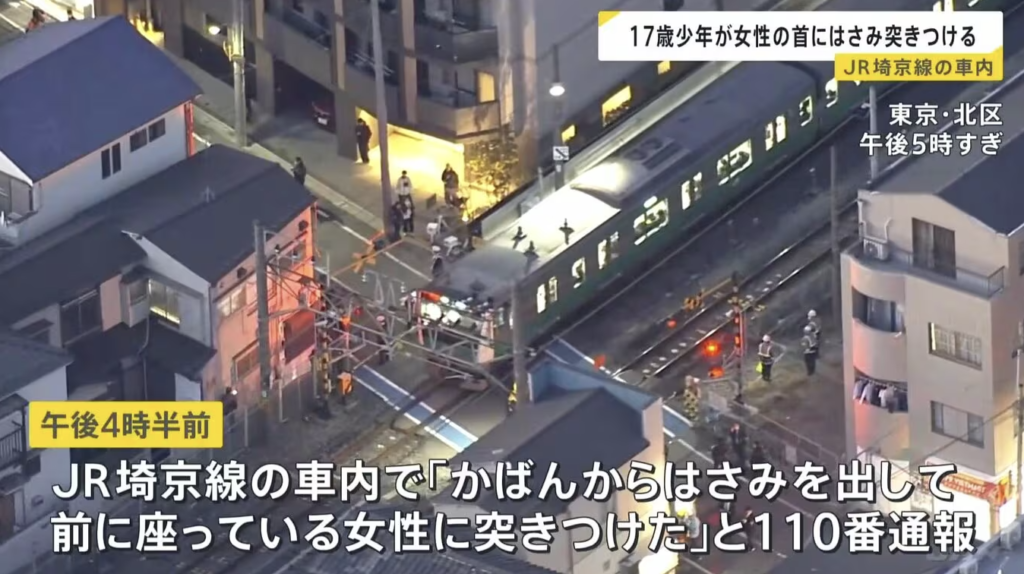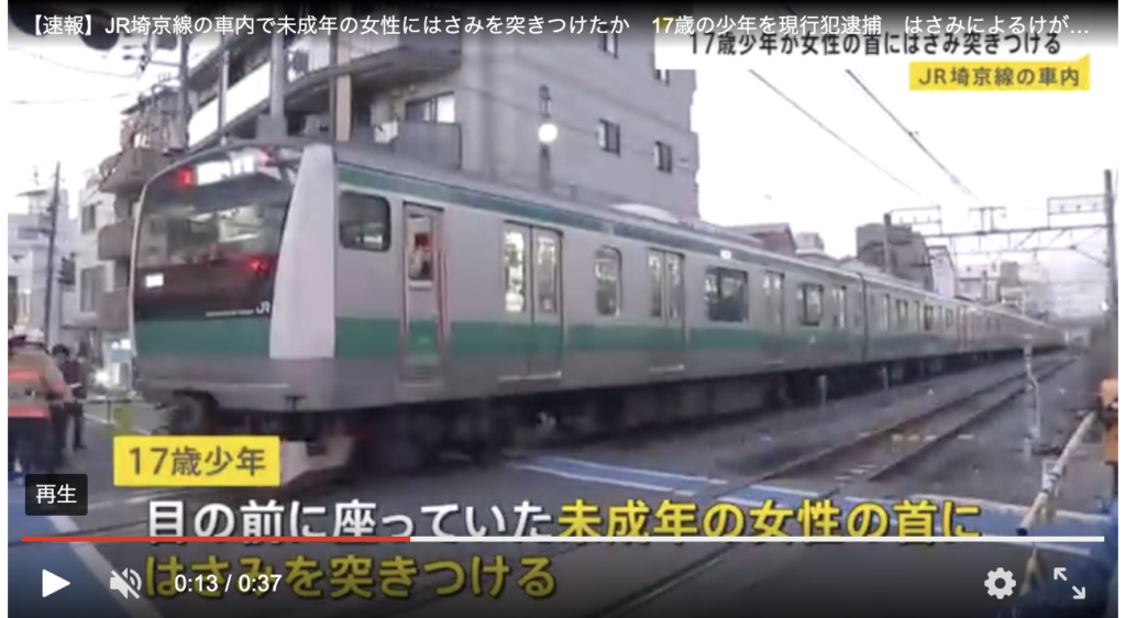 東京北区を走るJR埼京線の車内で、17歳の少年が未成年の女性にはさみを突きつけたとして現行犯逮捕されたとニュースでやっていた。