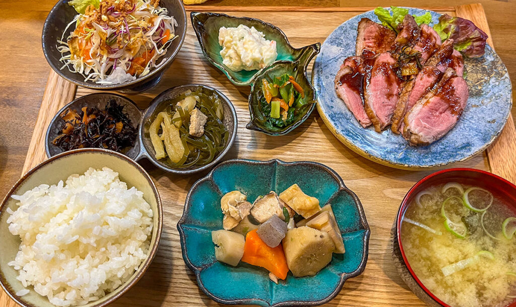 しっとり柔らかくかみごたえもある鴨肉に、さまざまな小鉢たち。