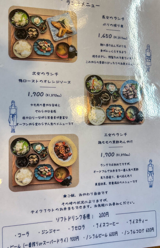 ランチは3種類。長女のランチはブリの照り焼き1650円。次女のランチは鴨ローストのオレンジソース1700円。三女のランチは鶏ももの黒酢あんかけ1700円。それぞれ税別