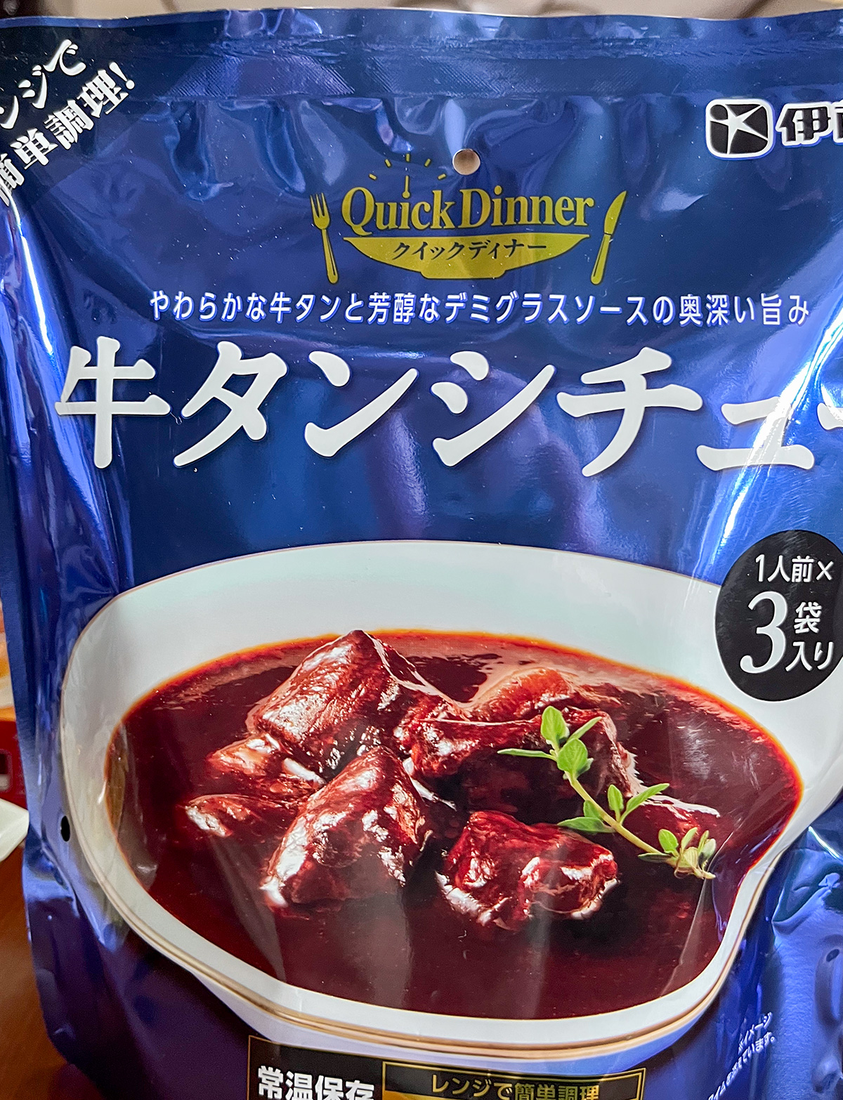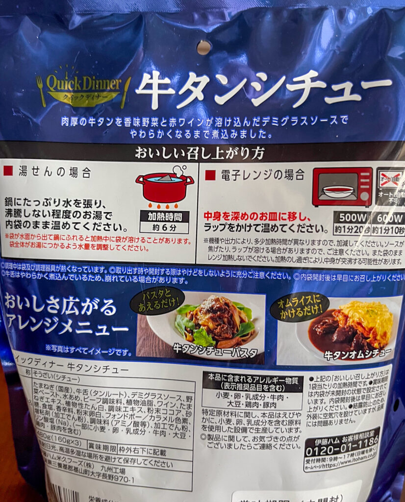 レンジで簡単調理のできる伊藤ハムの牛タンシチュー。3袋で1000円ちょっとかな。
