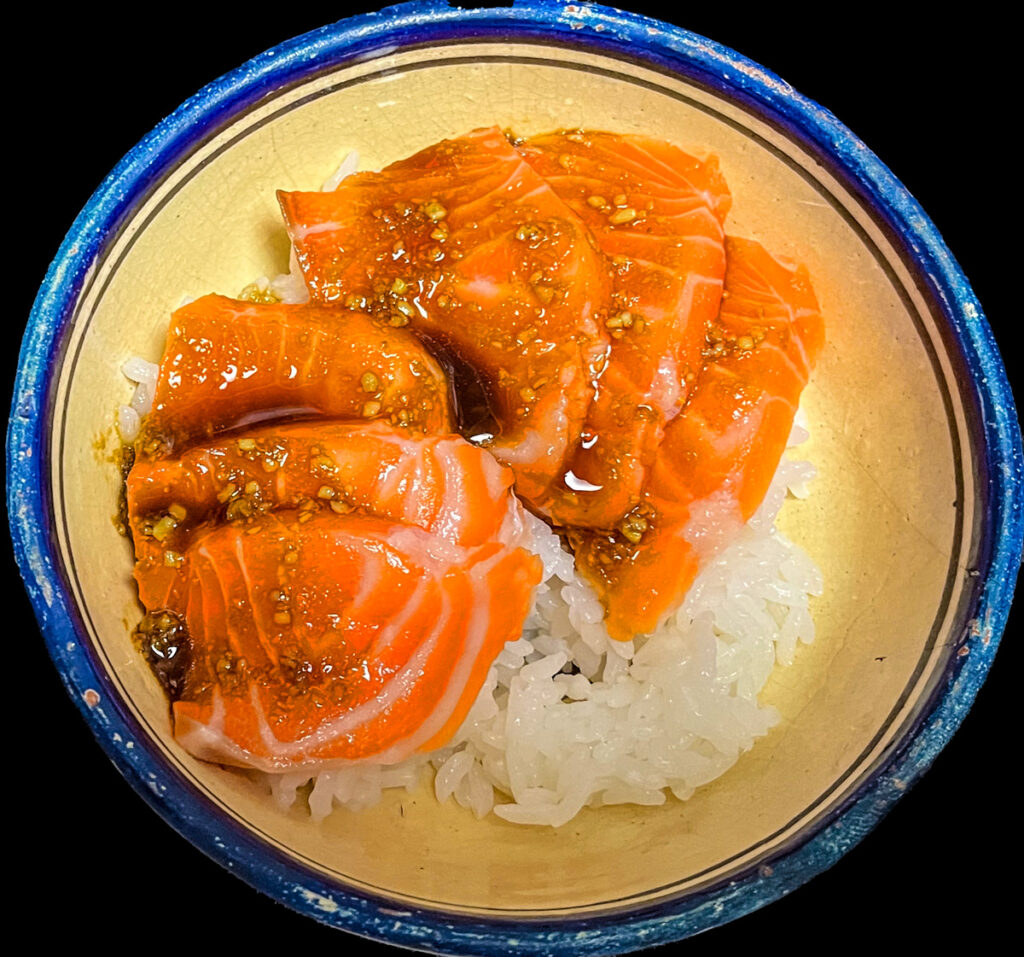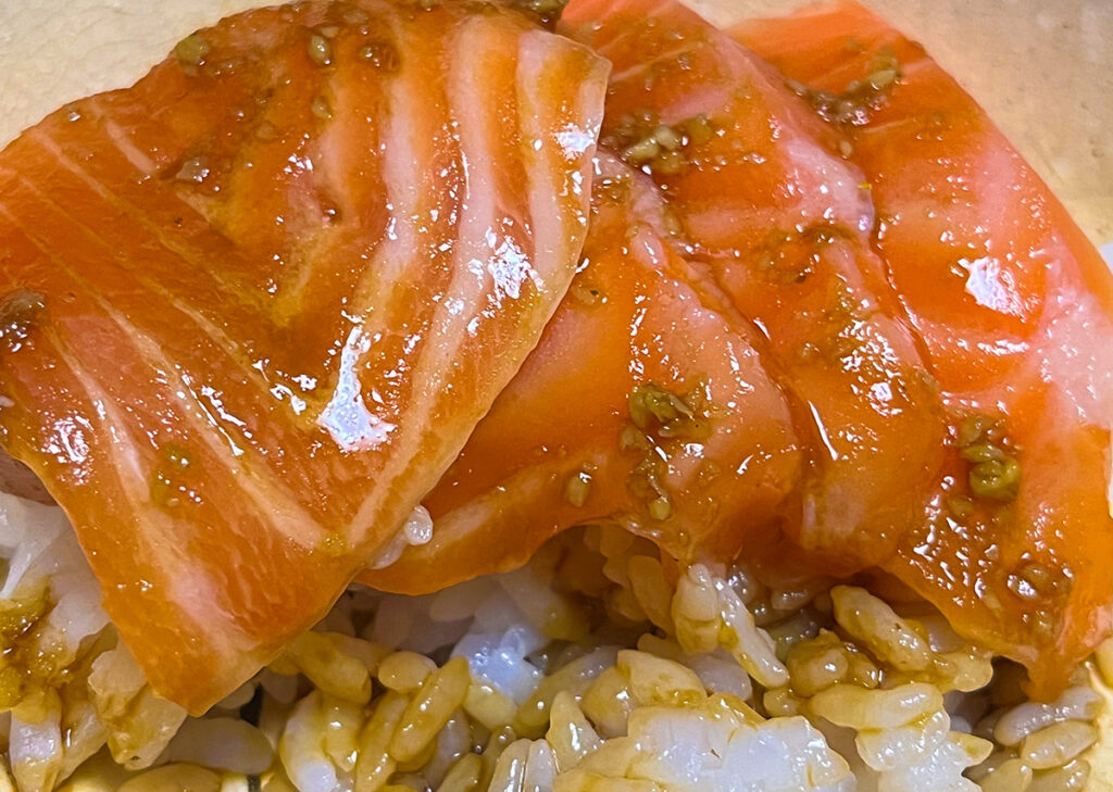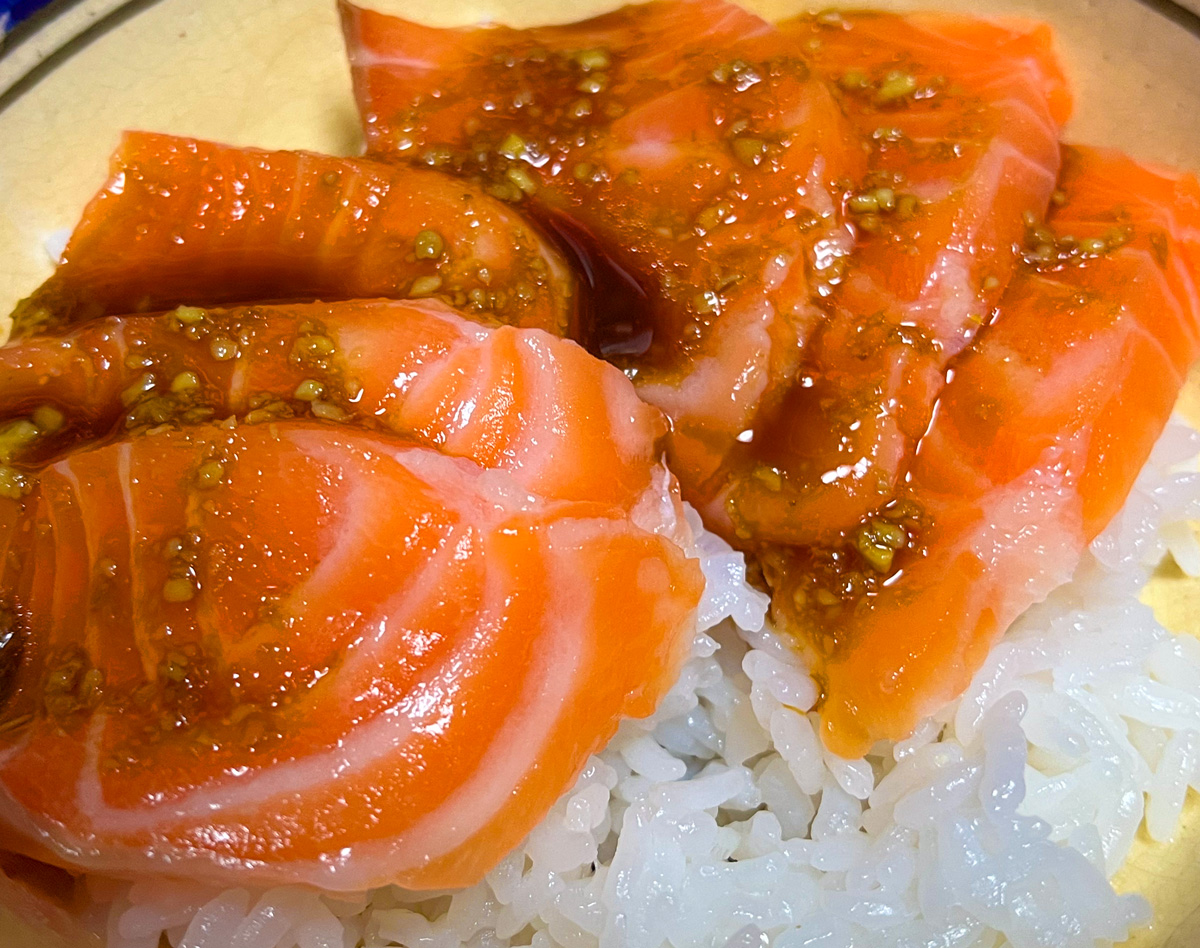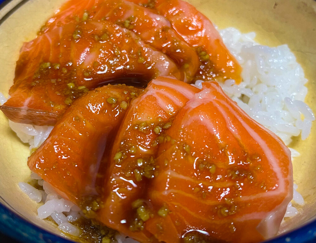 サーモン丼。サーモンにわさび醤油をからめて丼に。