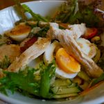 シュタムカフェの冷やしサラダうどんランチjun. 3rd thu. 2021 午前のよろず相談のあとのランチは、近くのシュタムへ。金曜じゃないのでグリーンカレーはないから、冷やしサラダうどんランチにしてみよう。 冷やしサラダうどんだと麺はもうちょっとやわかめでもいいなぁとは思うけど、しっかりした食感であっさりめのタレと、茹で卵やチキンと野菜とよくあう。 酸味のあるネギとゴボウにカボチャの煮っ転がしがいける。」 うどんはかなりのコシで味は控えめかな。 と冷たくシャクシャクなオニオンサラダもとても美味い。 デザートはいつくかある中からコーヒーゼリーをチョイス。 それにあいそうなのはやっぱりしっかりした味のアイスコーヒーだろうな。 練乳のかかったコーヒーゼリー香よく甘い、それに」苦味しっかり美味いアイスコーヒーがよくあう。 シュタムの過去記事:4/9のグリーンカレー┃グリーンカレーとクレープ┃県産野菜14種+1のベジサラダランチ┃ シュタム 住所:那覇市金城3-8-21…
