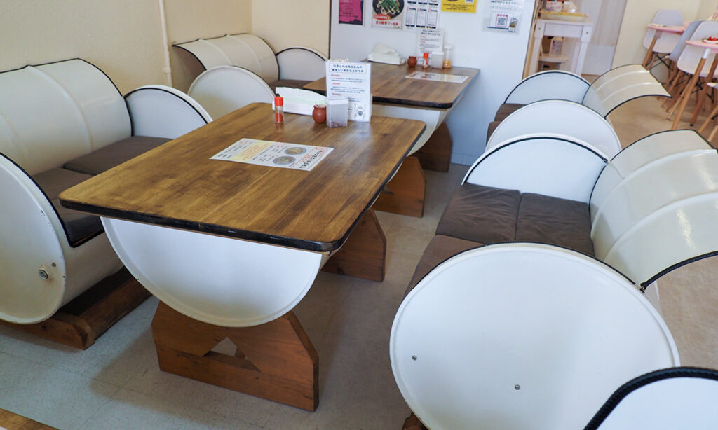 ガソリンタンクを使った椅子とテーブルがいい感じだ。