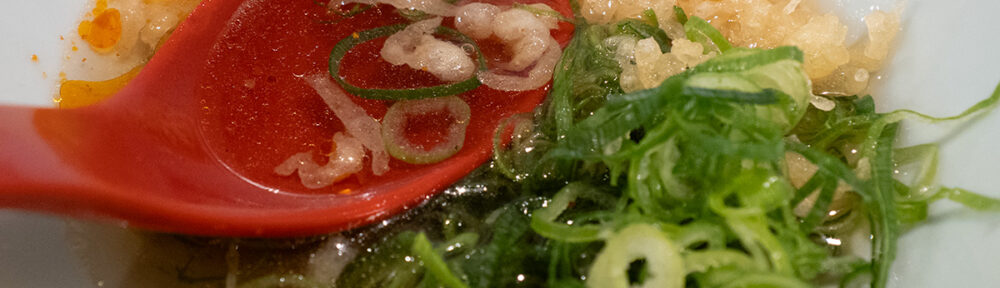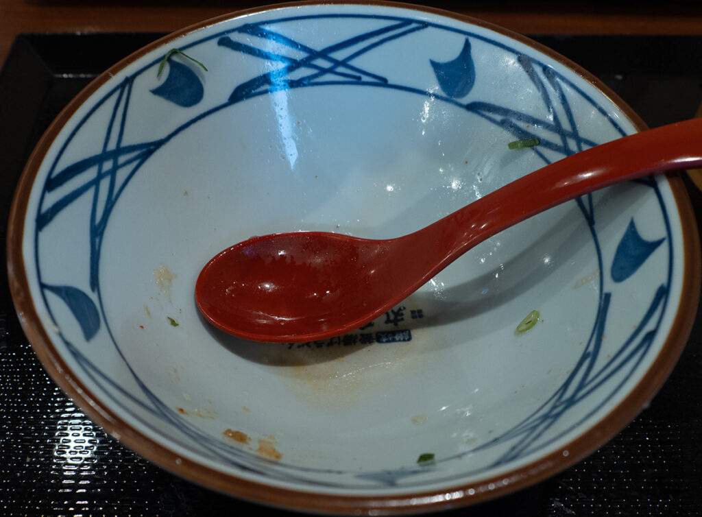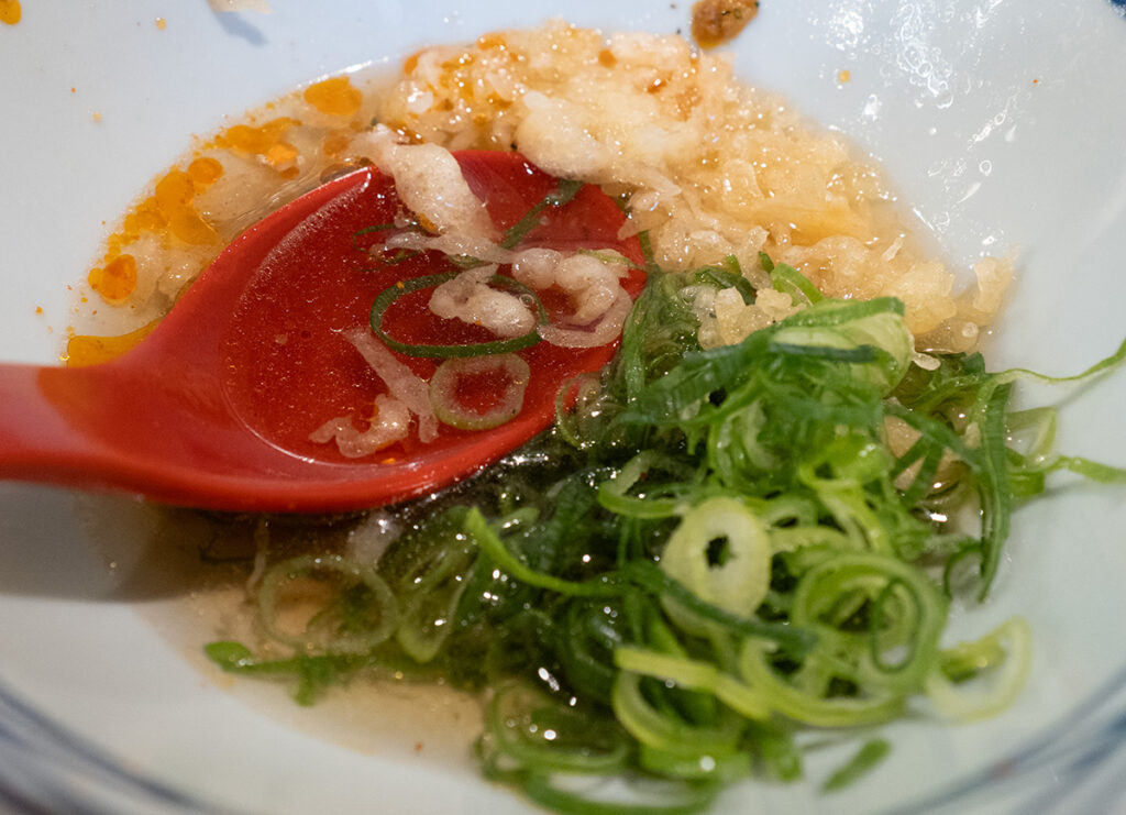 食べ終わったあとにちょっとスープをプラスして、ネギと天かすを加えてフィニッシュ。