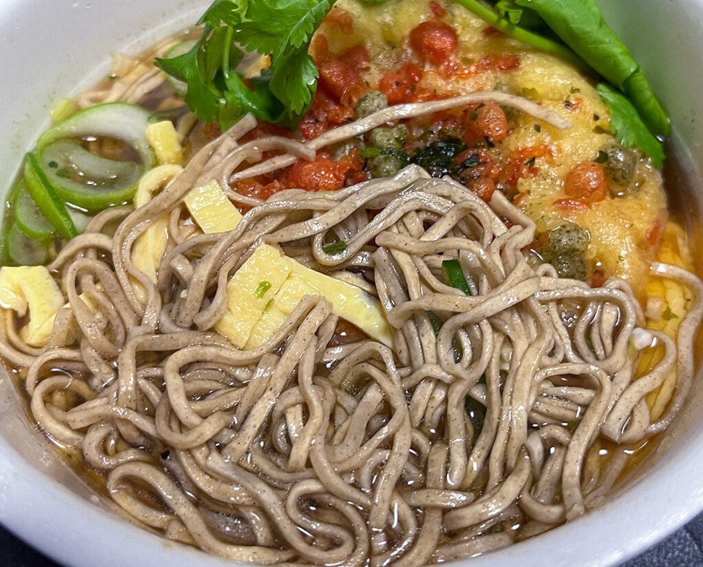 jun.26th sat. 2021 コンビニに気になった日清のどん兵衛ラー油香る太そば。 太そばとあるのでうどんかと思ったら蕎麦だった(^ ^; 冷やして追い卵とひと手間かけて美味いとあるけど、それはまたの機会に。 20日ネギとゆで卵をプラスしてみた。 カップな蕎麦の麺はそれなりに好きだけど汁の方が好みかな。 でも汁なしラー油のピリ辛さも悪くないな。 デザートは、フルーツたっぷりゼリー。なかなかいいね。 関連サイト:Facebook┃Twitter┃おきぐる┃Facebook┃Twitter┃おきぐる┃okinawaweb┃南風原タウン情報┃チーズ教室 ┃Okinawaweb Express┃mixi┃グシクムイ ブログ┃…
