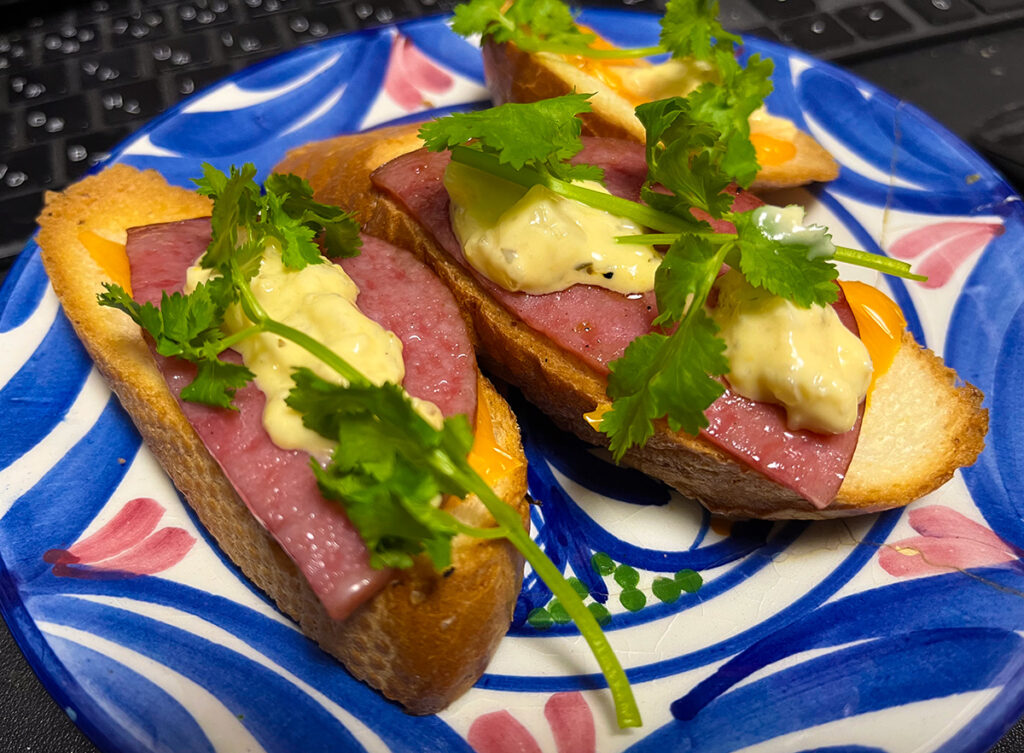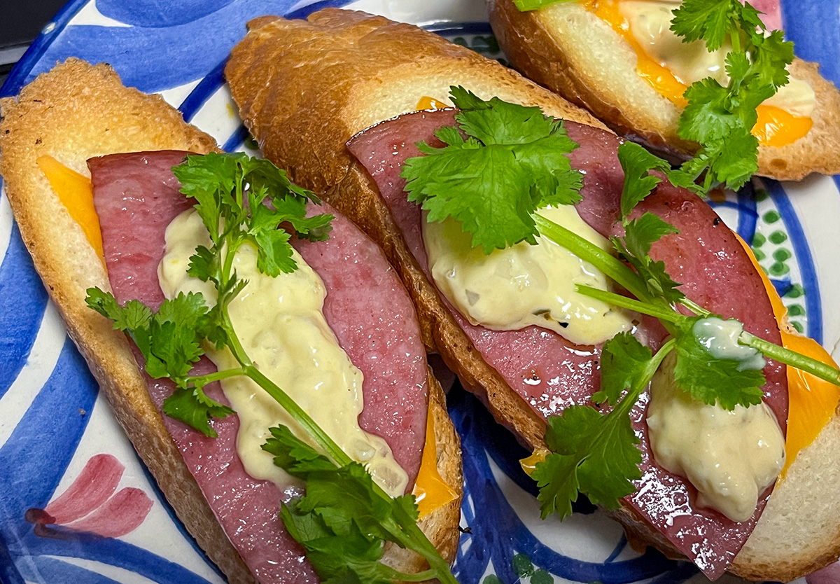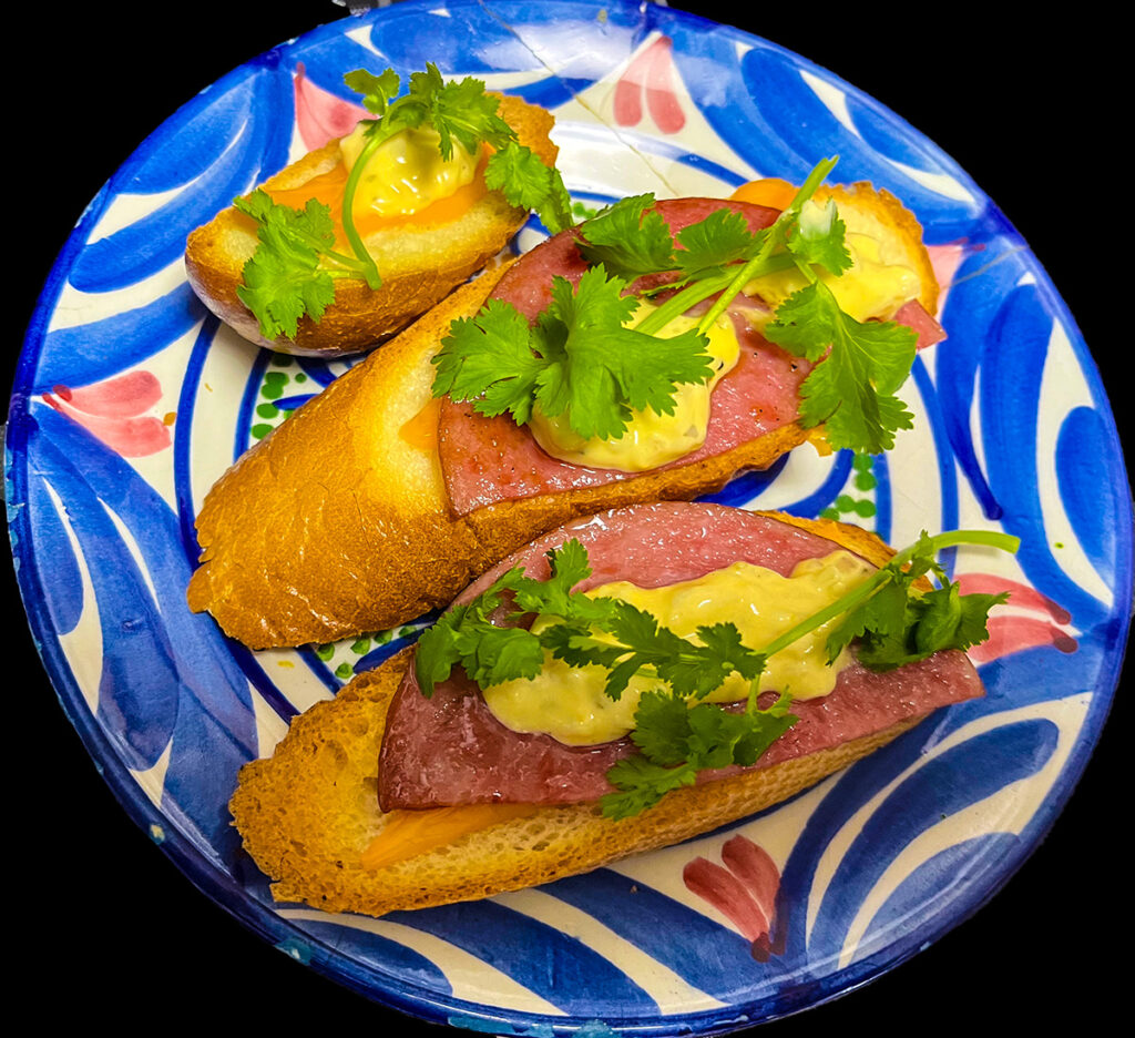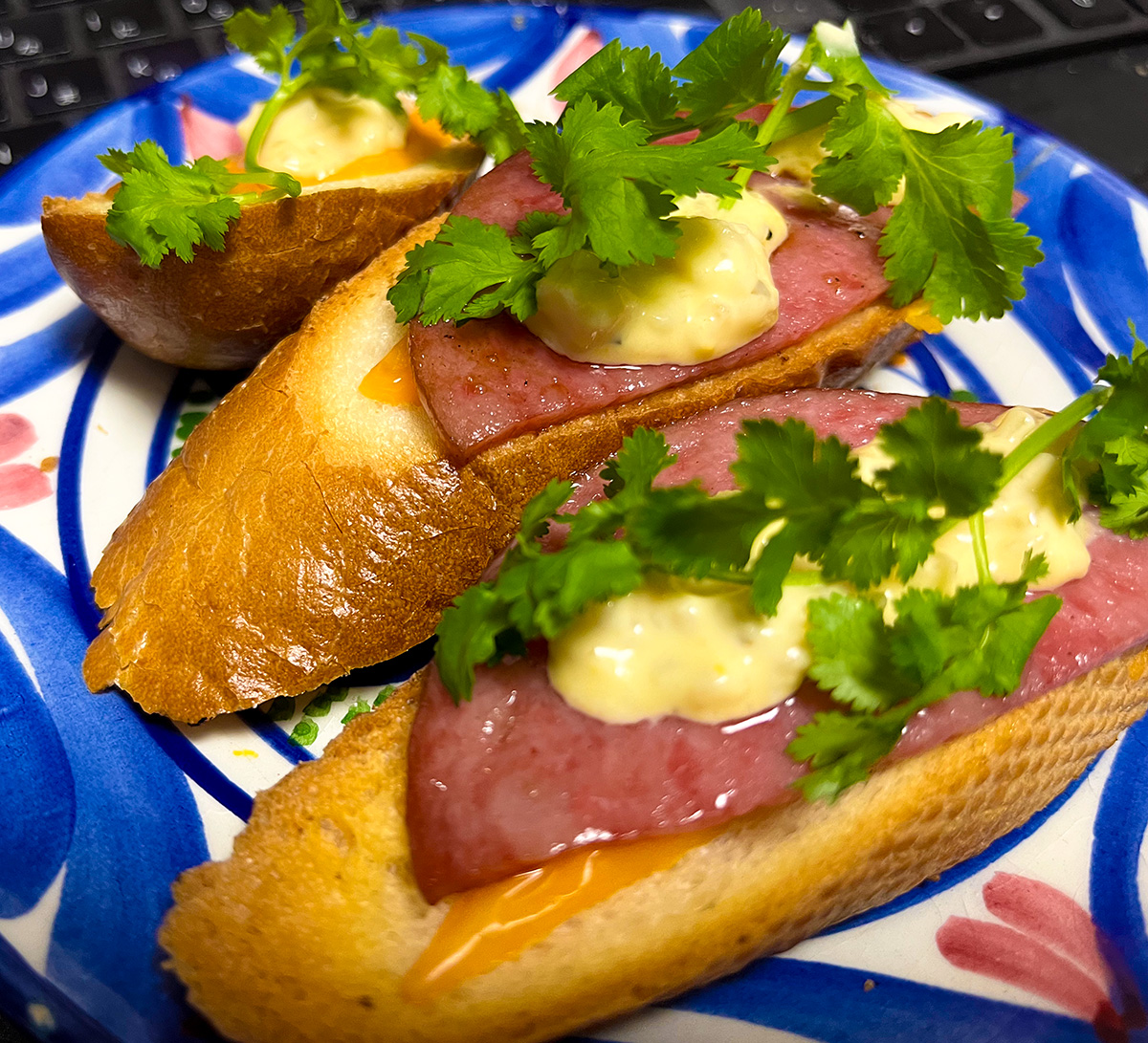 シンプルにチーズとソーセージにタルタルソースとパクチーで。