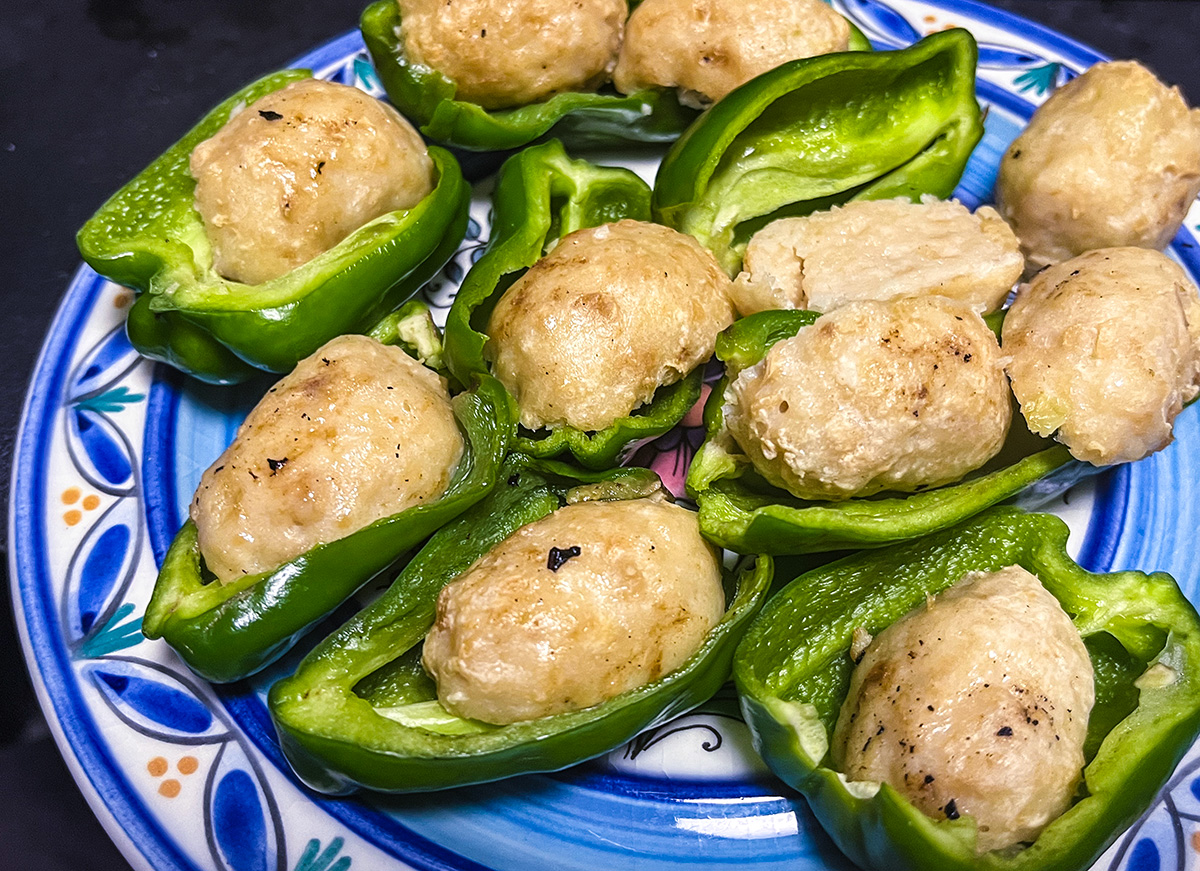 鶏団子は半分にカットした生ピーマンに詰めて食べると美味い。