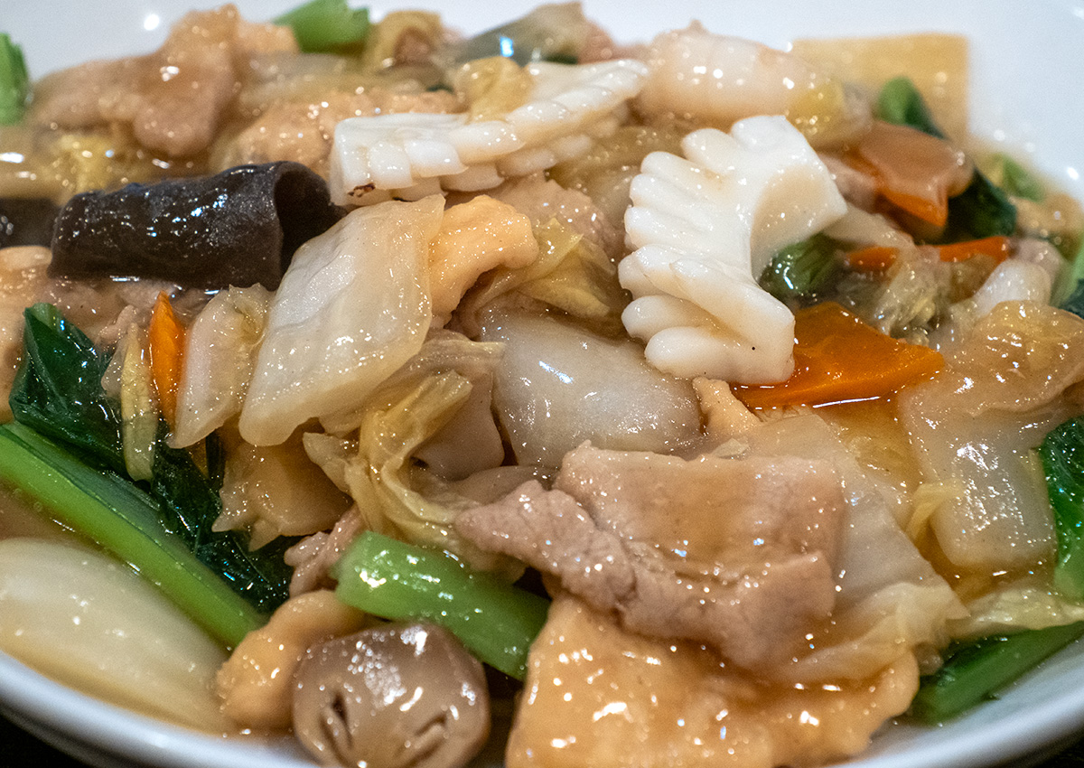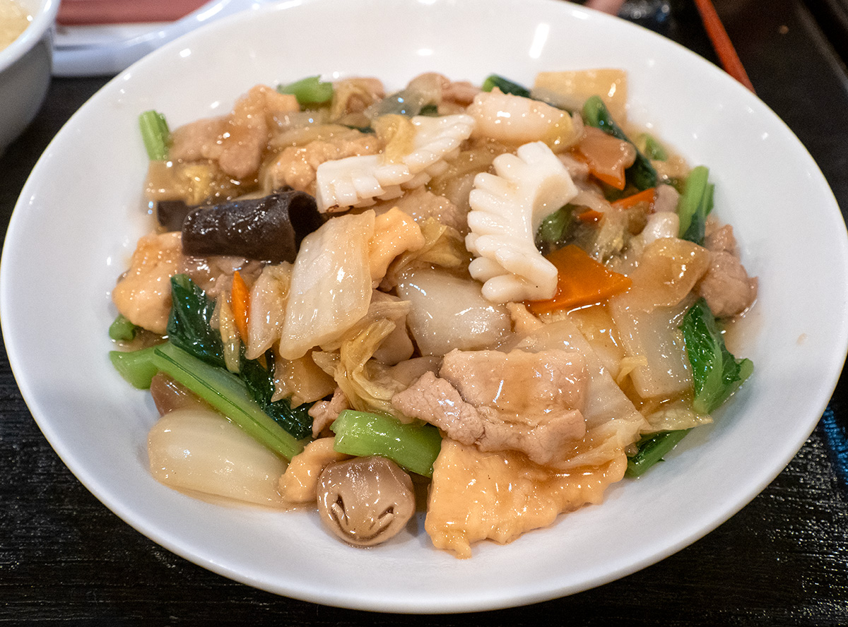 妻は五目焼きそば。海鮮や豚肉に野菜たっぷりのあんかけで1300円。