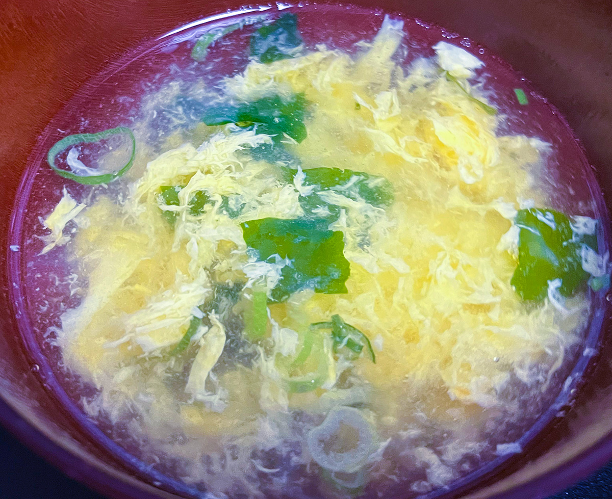 軽く漬けにしてから熱々ご飯にトッピング。インスタントのタマゴスープを友に。