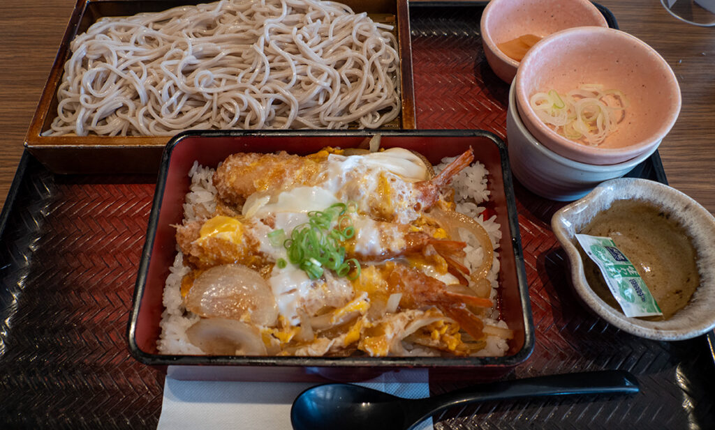 私は海老の玉子とじ重でざるそば。1680円。