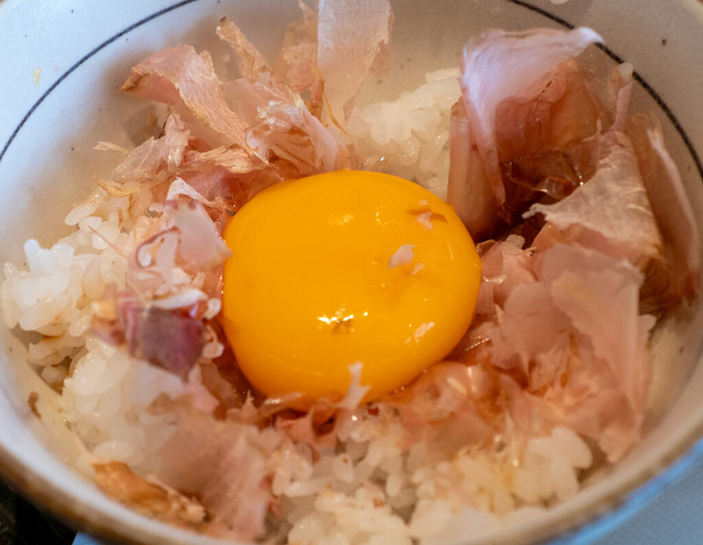 ご飯をちょっともらい、鰹節と黄身のごはんかけセット120円を試してみた。