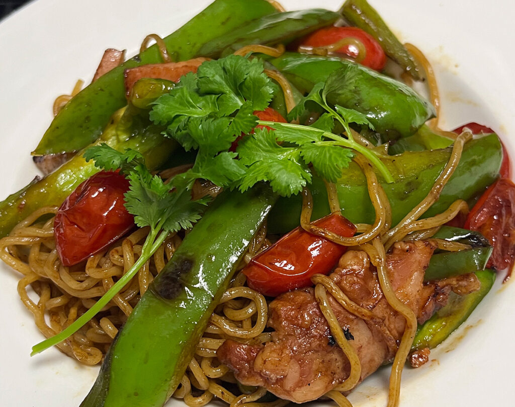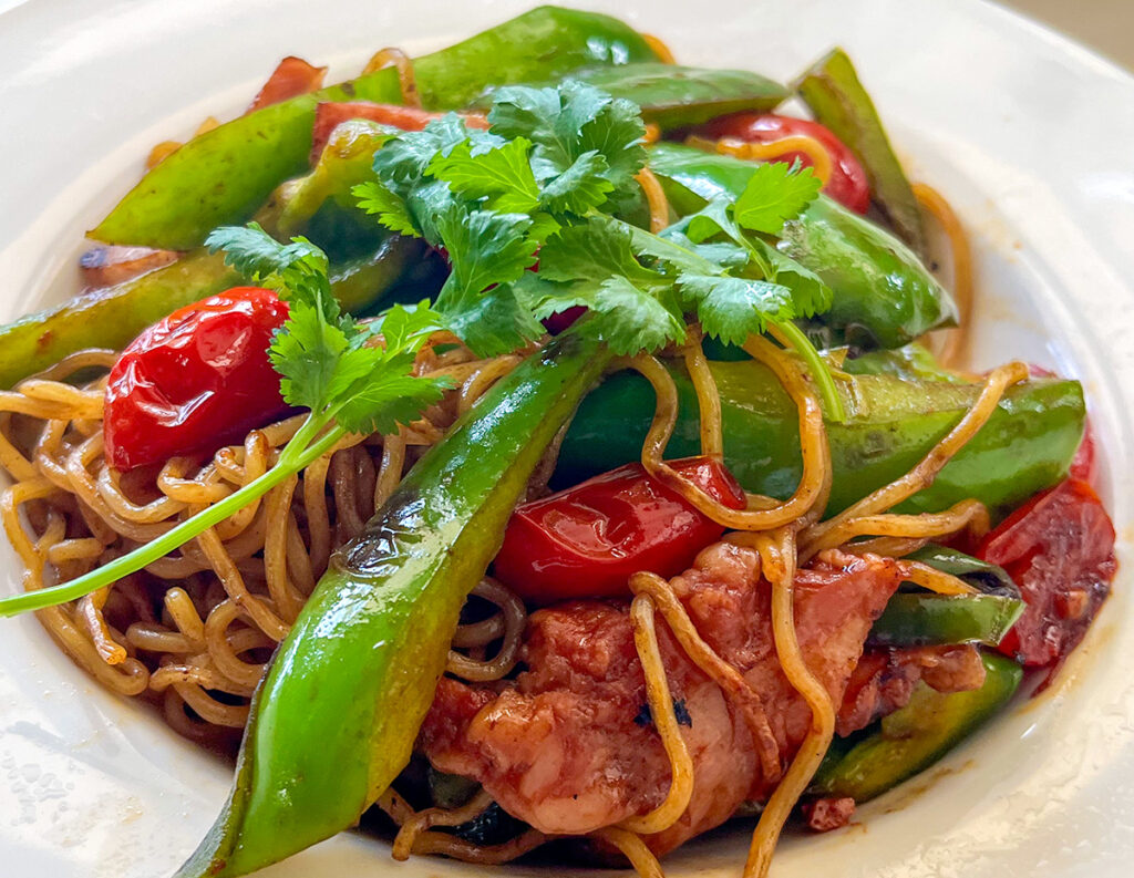幸和農園のピーマンとフルーツトマトに厚切りペーコンで焼きそば。