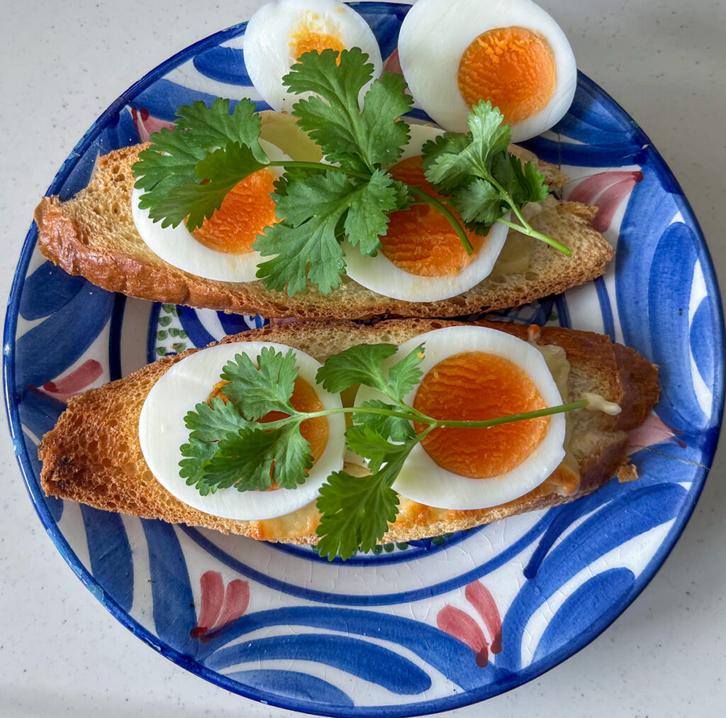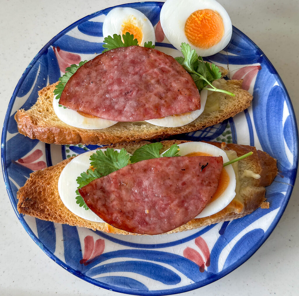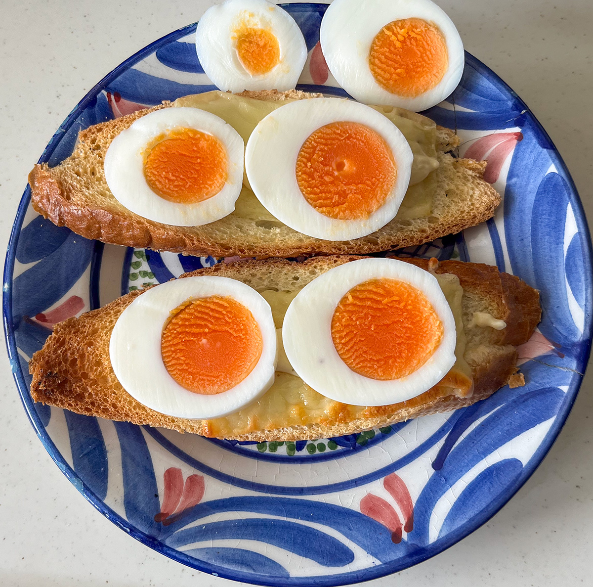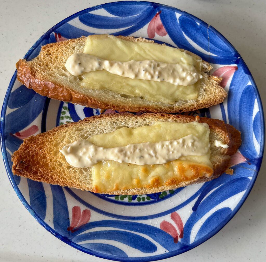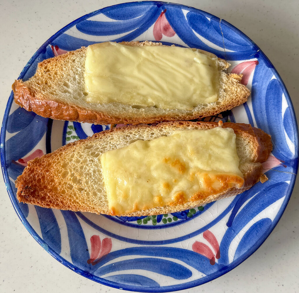 朝のいつものバゲット。まず片面を焼いたらひっくり返してメルティングチーズ。