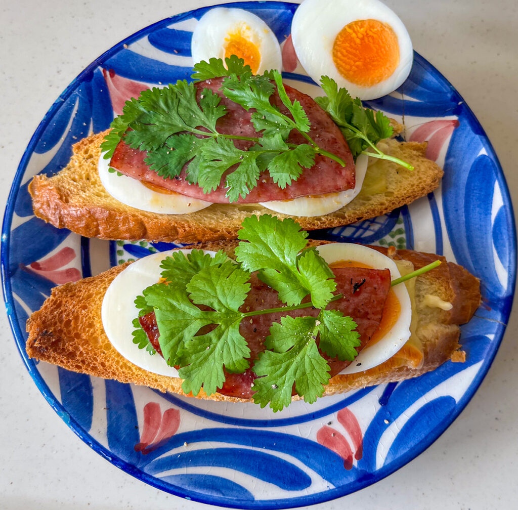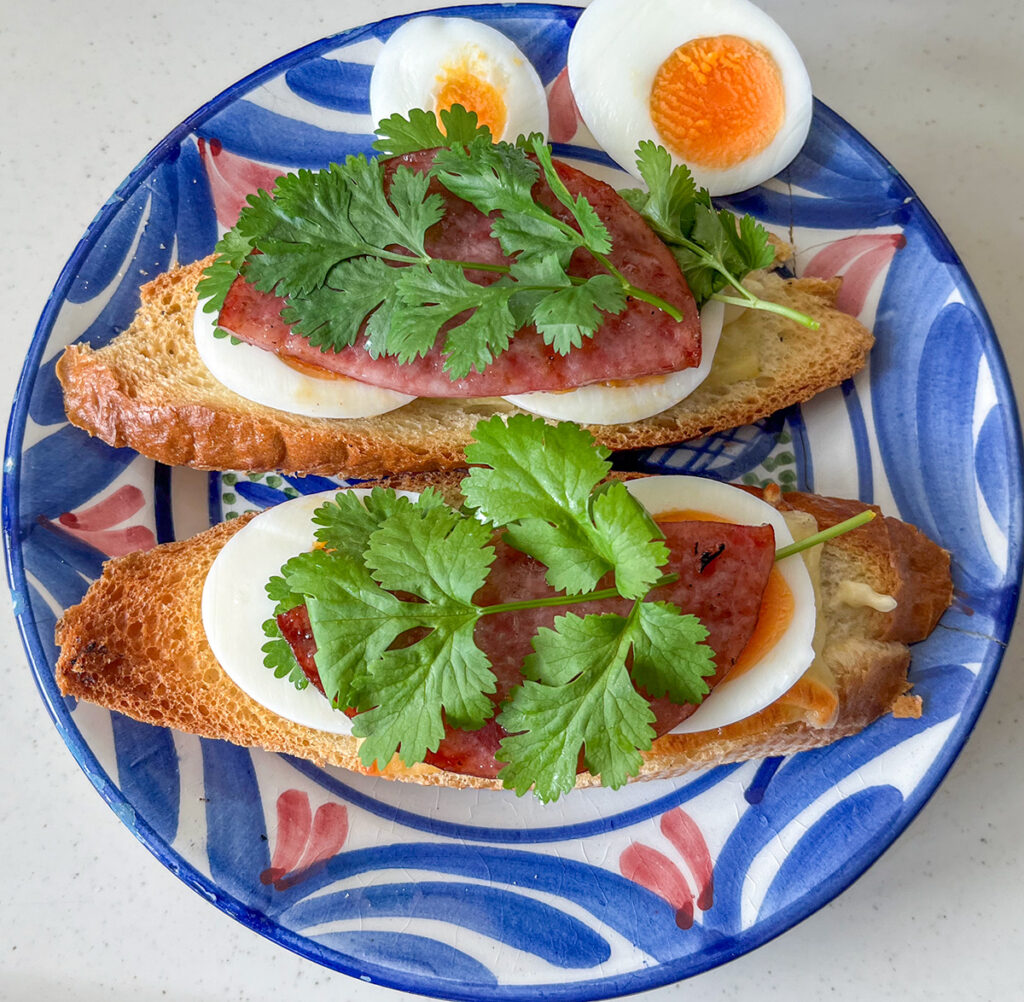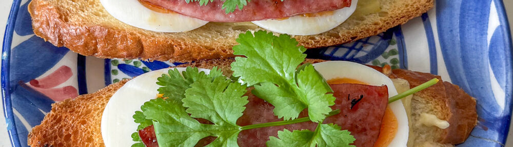 Morning baguette — layered with melted cheese, tartar sauce, eggs, cilantro, sausage, and ham, finished with a touch of black pepper.