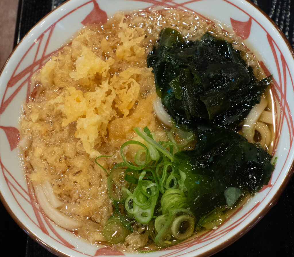 これはぶっかけうどん。それに無料の天かすやネギとわかめ。