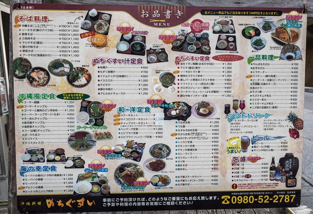 ここまで来るとちょっと先の名護曲食堂へ寄る事が多いんだけど、ここの隣りにも沖縄料理ぬちぐすいがあるのを発見。メニューもかなり多彩だし次回はここで食べるかな。
