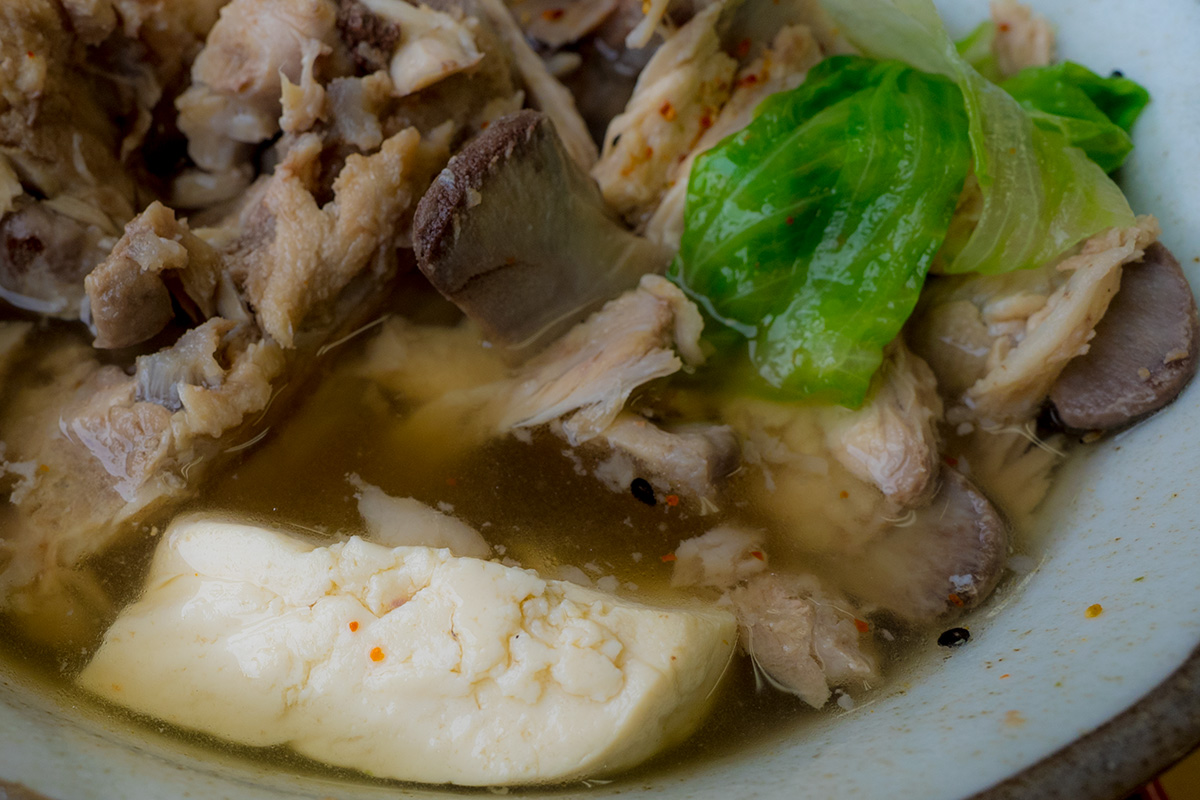 宮古そば六道の骨汁oct.25th tue. 2016 何だか最近、骨汁をだす店が増えて来たように思えるな。 火水木の12~15時くらいの営業だから今日は運がよかったようだ(^^ 確か宮古そばの愛にもあると思うけど、ここ六道も宮古そばの店。店の前を通り過ぎたことがあったので、うる覚えで来たけど無事に到着。 一辛から三辛のそばもあるけど、狙いはもちろん骨汁だ。 しばらくしてでてきたこれが骨汁650円。 青菜がのっているけど、野菜が高騰しているからレタスじゃないのかも? 昆布や豆腐はない潔さか? 肉はまぁ普通に美味いんだけど、ここはスープが素晴らしく美味い。 あっさりと甘みのある塩味で旨味もたっぷりだ。 この汁とご飯で雑炊にしてもいけるだろうなぁ。 …