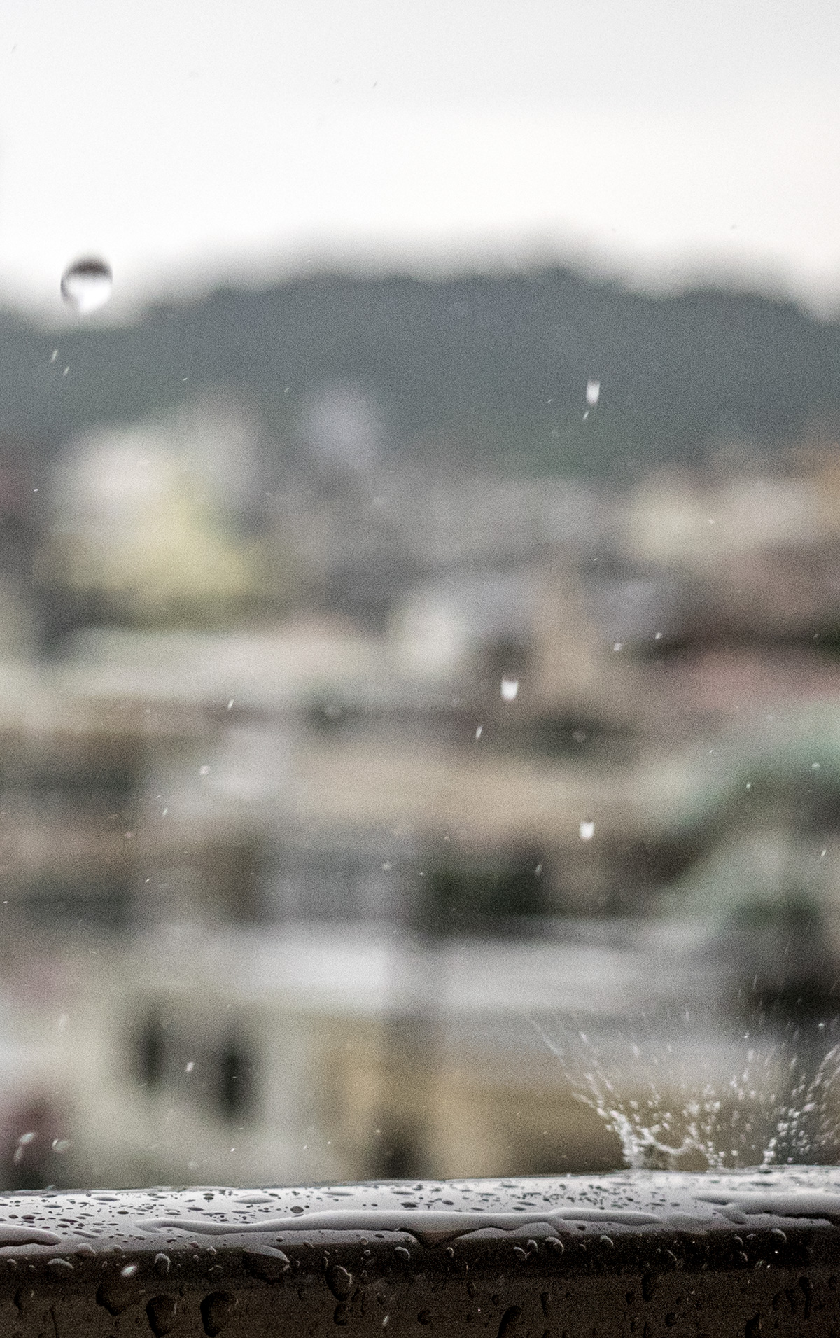 朝はいっときの大雨。雨粒が柵に落ちて飛び散る。