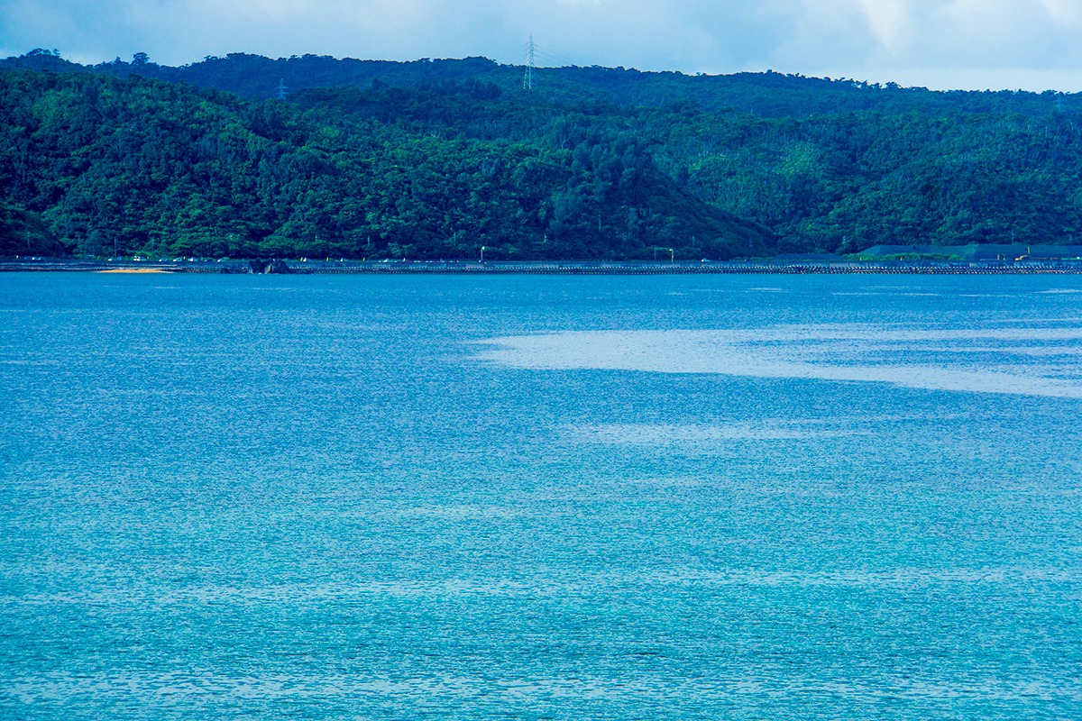 名護湾だからかあまり波もなく銀盤のように輝いて見える。