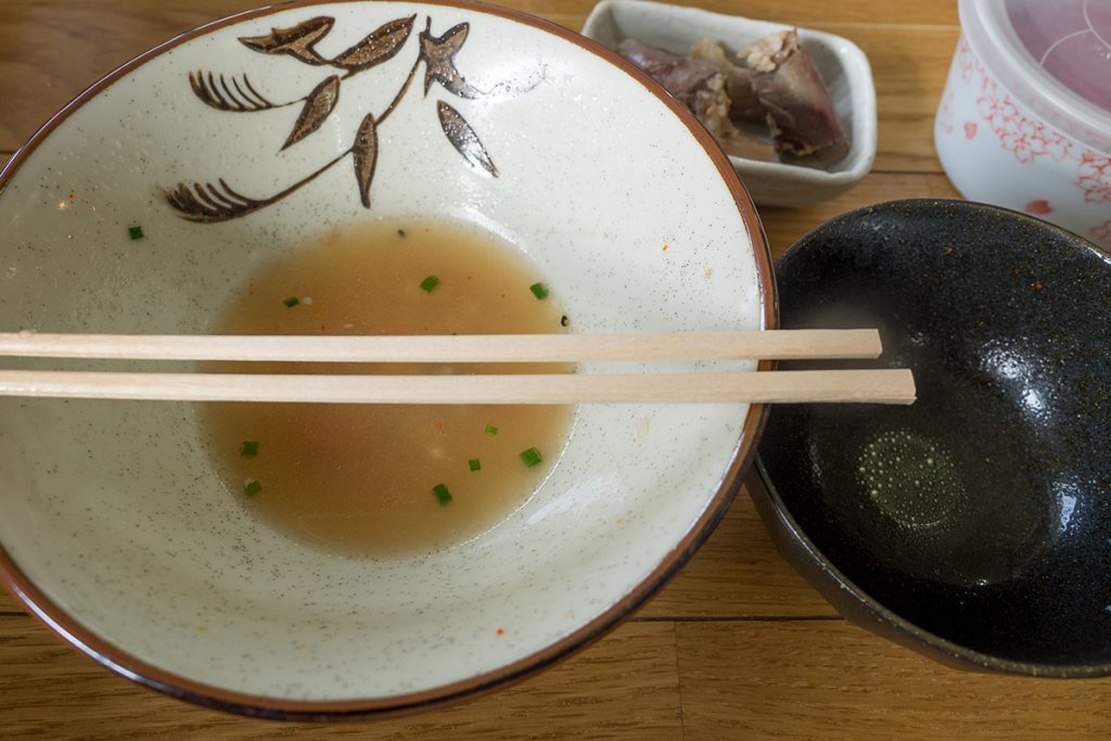 oct.25th tue. 2016 何だか最近、骨汁をだす店が増えて来たように思えるな。 火水木の12~15時くらいの営業だから今日は運がよかったようだ(^^ 確か宮古そばの愛にもあると思うけど、ここ六道も宮古そばの店。店の前を通り過ぎたことがあったので、うる覚えで来たけど無事に到着。 一辛から三辛のそばもあるけど、狙いはもちろん骨汁だ。 しばらくしてでてきたこれが骨汁650円。 青菜がのっているけど、野菜が高騰しているからレタスじゃないのかも? 昆布や豆腐はない潔さか? 肉はまぁ普通に美味いんだけど、ここはスープが素晴らしく美味い。 あっさりと甘みのある塩味で旨味もたっぷりだ。 この汁とご飯で雑炊にしてもいけるだろうなぁ。 …